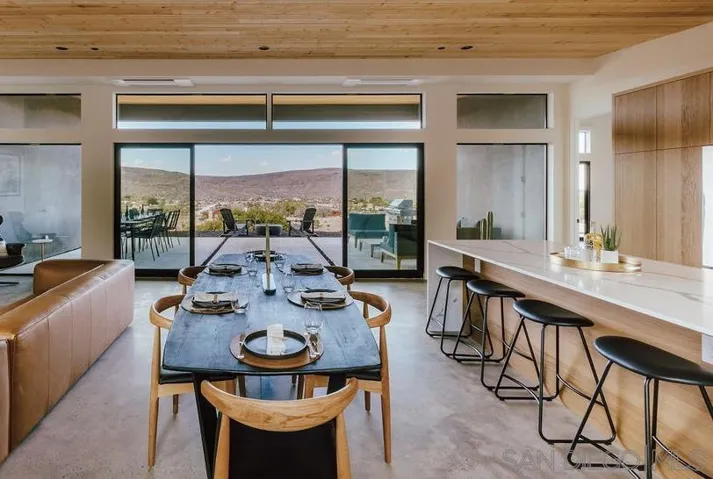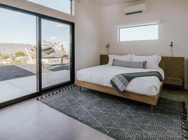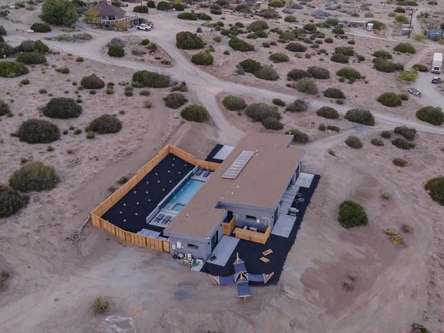 A new modern home perched on a peaceful hill looking over Pioneertown! This prime location allows you to hop over to Pappy and Harriet’s and see a concert or grab dinner! If you are looking to Visit Joshua Tree, the park entrance is only a 20 minute drive. However, with a pool, hot tub, custom hammocks, firepit, games, multiple outdoor areas, this home has everything you need for a peaceful home.