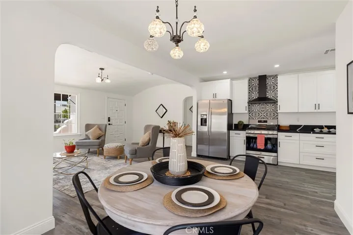 The updated kitchen seamlessly blends modern Spanish charm with functionality, featuring handcrafted-style tile backsplash, sleek countertops, open shelving, and brand-new stainless-steel appliances — perfect for both everyday living and entertainment.