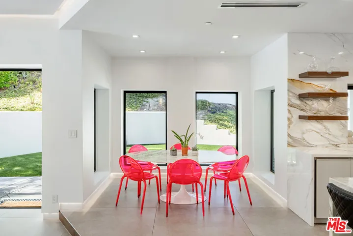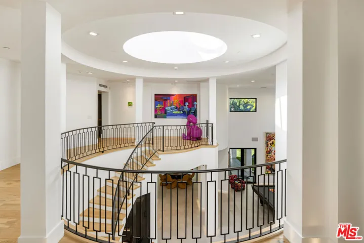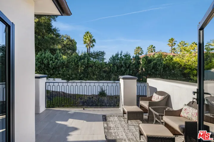 Nestled within the coveted guard-gated enclave of Monte Verde Estates and bordering the prestigious El Caballero Country Club, this Montecito-inspired Spanish estate blends timeless elegance with modern innovation. Behind an oversized metal front door, you’re met with a dramatic rotunda foyer with a skylit stairwell and sweeping spiral staircase, illuminated by motion-activated LED stairs, offering a striking first impression. All interior doors feature magnetic locks with resting spots for a seamless and modern closure. Expansive metal windows and custom doors invite natural light and serene hillside views, reinforcing a seamless connection to nature. The main level is designed for both grand entertaining and everyday comfort. Two bedrooms flank the great room and formal living room, anchored by a 20-foot genuine Calcutta gold marble fireplace and a custom wet bar. A temperature-controlled wine cellar adds a refined touch for the wine enthusiast. The formal dining room, featuring a stunning Tom Dixon chandelier, overlooks a lush putting green and transitions effortlessly into the gourmet chef’s kitchenappointed with Calcutta marble countertops, Porcelanosa tile, professional-grade stainless steel appliances, and sleek Leicht German cabinetry. The kitchen opens into a relaxed family room with a fireplace and extends outdoors through roll-away pocket doors to an expansive covered terrace, equipped with multiple heaters. Experience numerous lounge and dining areas that frame the outdoor kitchen, firepit, pool, spa, TV, and lighted sports court, creating a private resort-like sanctuary. Upstairs, a recreational room with an en-suite bath can easily be converted to a seventh bedroom and is complemented by three additional en suite bedrooms, each uniquely designed with Porcelanosa bathroom hardware and distinct finishes.The primary suite crowns the residence with a sitting area and fireplace, Tom Dixon chandelier, private viewing deck, and a spa-inspired bath featuring a jetted tub, steam shower, dual vanities, and two custom walk-in closets. Notably, the master bathroom also includes a heated floor and a dramatic backlit onyx entrance wall, blending spa-like comfort with contemporary style. This estate integrates state-of-the-art technology throughout, including a full Crestron system accessible via three wall-mounted iPads that allow you to walk the home and control lighting, climate, entertainment, security, and more. Additional features include LED baseboards, whole-home surround sound, and 23 security cameras for uncompromising safety. The garage features a security door and is outfitted with Omer Ferrari double lifts, perfect for the car enthusiast. Meticulously upgraded and designed to embody modern luxury, this estate stands as one of the finest offerings within a premier gated community. Just moments from fine dining, shopping, and top-rated schools, it captures the perfect balance of elegance, smart home innovation, and refined convenience.