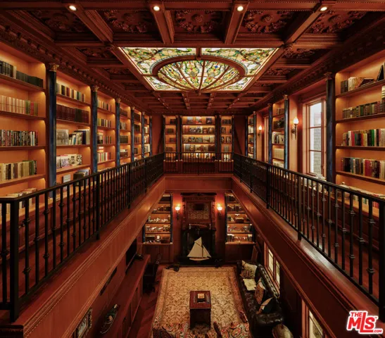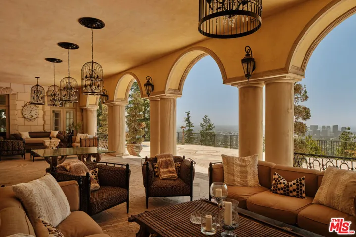 Poised high atop a promontory, this palatial European Estate boasts jaw-dropping 360 degree views of all of Los Angeles. Rich in privacy behind gates and up the long tree-lined driveway, this fortress of unparalleled magnitude is revealed. Situated in a world of its own overlooking the stunning gardens and city, this home is the epitome of royal living in the most sought-after city in the country. High ceilings, ornate details and grand-scale rooms are showcased beyond the luxurious foyer and Imperial Staircase through the massive double door entrance. Highlights from the main floor include an industrial grade chef’s kitchen with an adjacent light and bright breakfast room, a formal dining room with double doors made with Venetian stained glass windows, an impressive living room with a gorgeous bar and fireplace, a billiards room, and a formal sitting room. Among the many jewels of this home is the two story library which includes a steel spiral staircase and a vibrant irreplaceable stained glass light fixture. Upstairs, the master bedroom rivals that of a European castle with multiple private terraces, city and nature views, his and hers closets, a massage room and a luxurious bathroom made with lapis stone. In addition to the master suite there are four oversized en suite bedrooms each with beautiful views and walk in closets. The lower level is an entertainer’s paradise with a theater, ballroom that opens up to a sprawling terrace where your guests can soak in the picturesque views, and a wine cellar that’s authentically outfitted as the storefront of an early 18th century English saloon. The backyard consists of a sparkling pool and spa, outdoor kitchen, putting green, a fruit and vegetable garden, tennis court, koi pond, and endless places for dining al fresco. In addition to the various amenities, the home is also equipped with an oversized gym. This tranquil oasis is quintessential to the highest class of luxury living, built for those who hold history, design, and beauty in the highest regard.