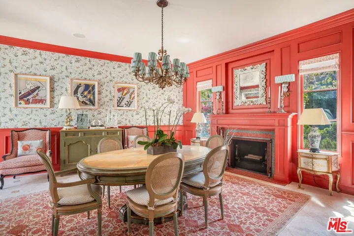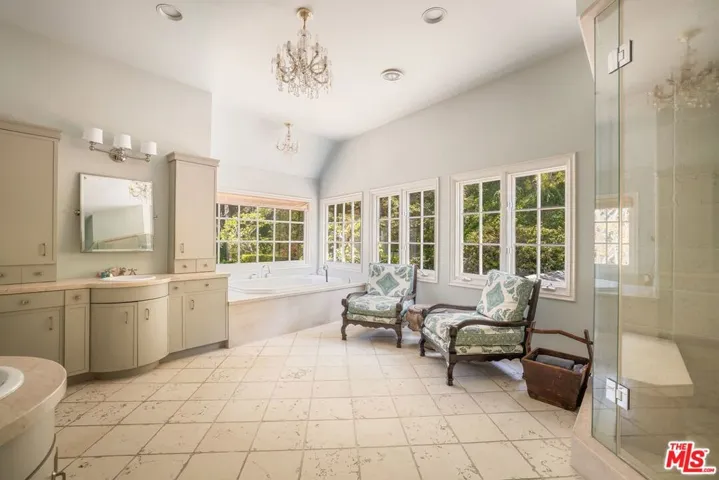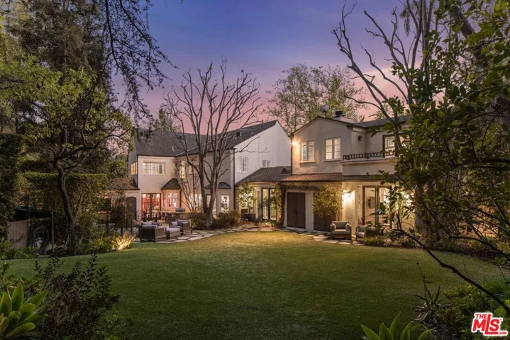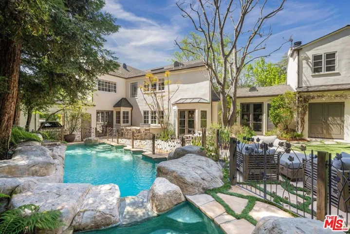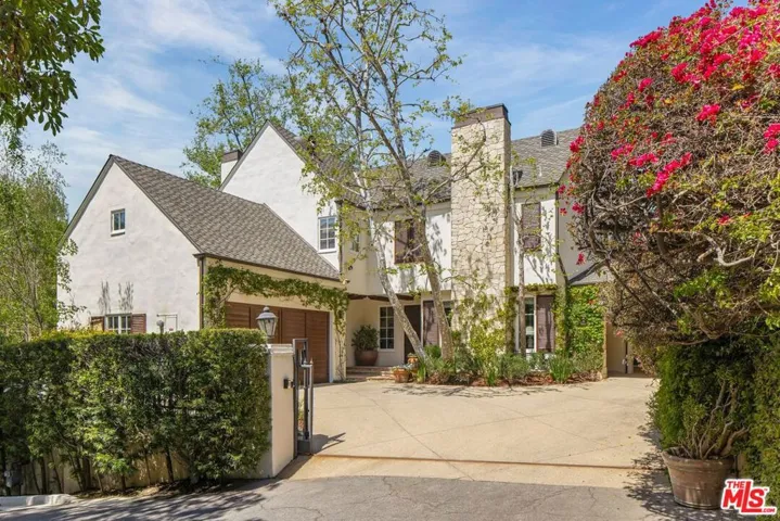 Located at the end of a private drive and tucked away behind a set of gates, this stately 5-bedroom, 6-bath traditional home rests on a 40,873-square-foot flat parcel, exuding charm and timeless sophistication. Sunlight floods the interiors, where nearly every room enjoys a connection to the outdoors and beautiful vistas. The main level opens with a formal living room beneath vaulted, wood-beamed ceilings, flowing into an elegant dining room complete with a fireplace framed by a detailed custom mantel and wet bar. A warm and inviting family room offers the perfect setting for relaxed gatherings. The gourmet kitchen features a center island, professional-grade appliances, and a breakfast nook with French doors opening to the gardens. The grounds, designed by acclaimed landscape architect Garrett Carlson, are a private sanctuary. Lush plantings surround a sparkling pool and spa, a basketball court, and a detached studio ideal for creative pursuits or a guest hideaway.Upstairs, the impressive primary suite boasts treetop views, a walk-in closet, and a spa-like bath with a steam shower, double vanities and soaking tub. Four additional bedrooms, a gym, and a study complete the home. Conveniently positioned near top-rated schools, world-class dining, and cultural landmarks including the iconic Getty Center this residence captures the essence of the California lifestyle.