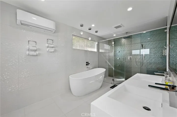 The living room boasts a grand fireplace and custom paintwork with elegant accent walls that bring warmth and personality to the space. Both bathrooms are tastefully remodeled with exquisite tile work, modern fixtures, and separate temperature controls for your comfort.