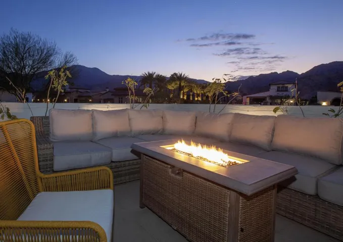 Turnkey furnished home in the recently built, short term rental approved, community of PGA West Signature. Professionally curated by award winning interior designer, Patricia Lockwood, of Design Vision Studio, this 1960 square foot home is not to be missed. Situated on a south facing lot with Santa Rosa mountain views and just a few steps to the Signature Clubhouse, resort style pool, and fitness center. This open concept floor plan features a chef’s kitchen with stainless steel appliances, quartz countertops and white shaker cabinetry. The primary bedroom is located downstairs with a large ensuite bath with double vanity and quartz countertops. Two separate living/entertaining areas highlight the home; one on the main floor, and upstairs you will find the Frank Sinatra inspired bonus room, with wet bar. Two additional guest rooms and a full bath round out the upper level. Relax and entertain in the secluded front yard patio for al fresco dining and evenings spent in front of your private firpit overlooking Coral Mountain. PGA West boasts 6 golf courses (3 public, 3 private) as well as a state of the art Fitness and Sports Club (separate membership). This meticulous home is currently being used as a short term rental and is being sold turnkey furnished. HOA fees include 24 hour guard gated security, internet, cable and front yard maintenance. Leased solar is $39/month and must be assumed by new buyer. Buyer to pay City transfer fee.