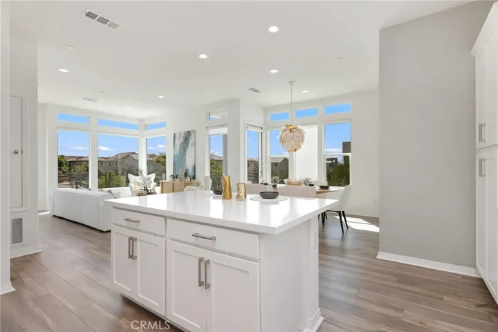 The second floor serves as the heart of the home, featuring an open-concept kitchen, dinning, and living area adorned with recessed lighting, remote-control curtains, and large windows that fill the home with abundant natural light. The chef’s kitchen is beautifully appointed with a double-door refrigerator and freezer, stand-alone dual ovens, a built-in stovetop, and custom cabinetry, offering the ideal combination of style and convenience.