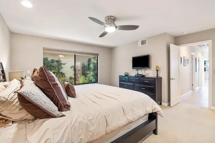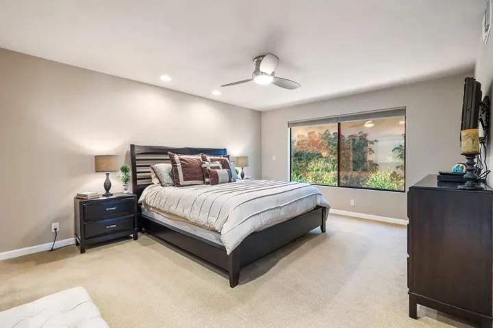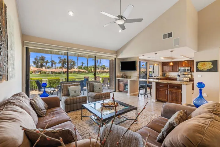 Fabulous fairway, water and mountain VIEWS from the extended patio of this REMODELED, move in ready, 2BD+Den/2BA 300 Max Plan. Open floorplan with professional, contemporary finishes. Recessed LED lighting, designer paint, tile & carpet, custom window coverings, and ceiling fans throughout. Beautiful kitchen remodel features granite counters, stainless GE appliances with gas cooktop, pass-thru to dining, and added counter bar. Kitchen wall has been removed and atrium has been converted, creating a seamless flow from the kitchen to the living areas. Wonderful tile, lighting & hardware in remodeled baths too. Spacious primary bedroom includes a walk-in closet, plus additional storage (or small office) above with a drop-down ladder for access. Large 2-car garage with garage opener installed Aug 2020 & water heater installed Jan 2021. Just steps to a fantastic community pool & spa. Offered designer furnished per inventory list. Annual golf course overseeding in progress. The course will be lush and green by November.
