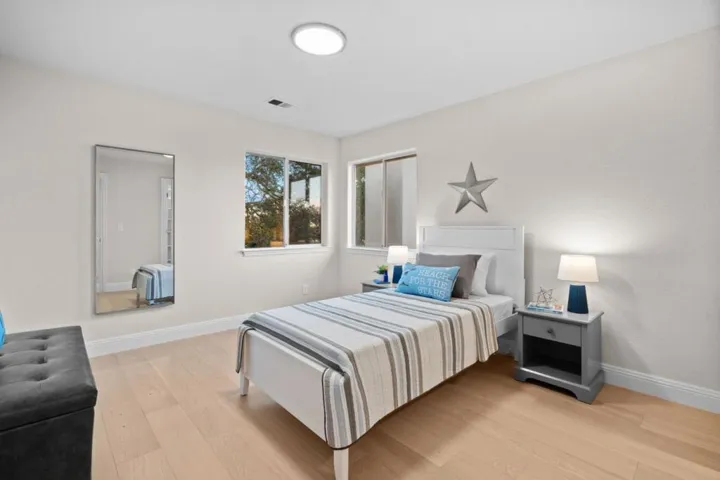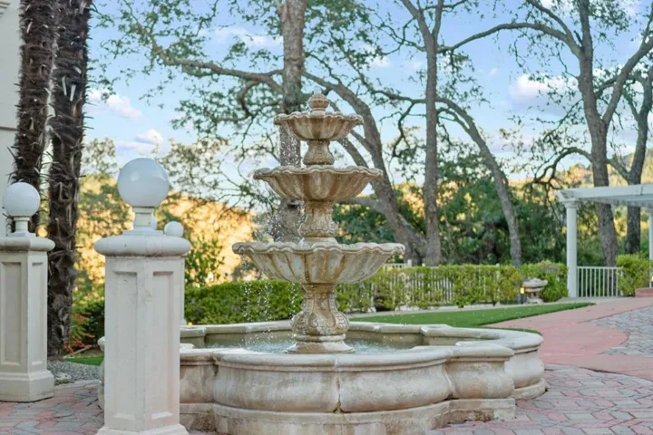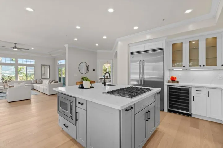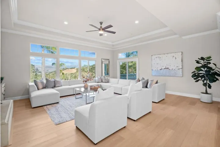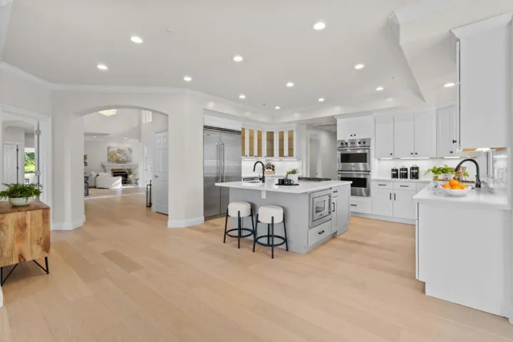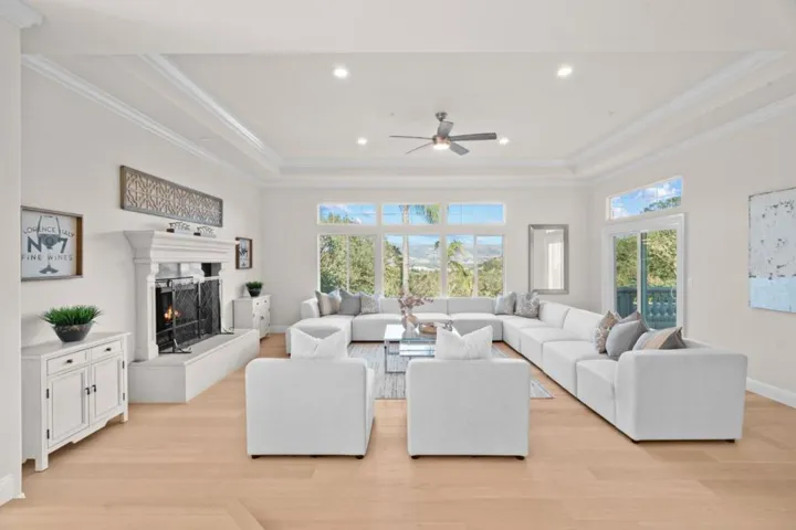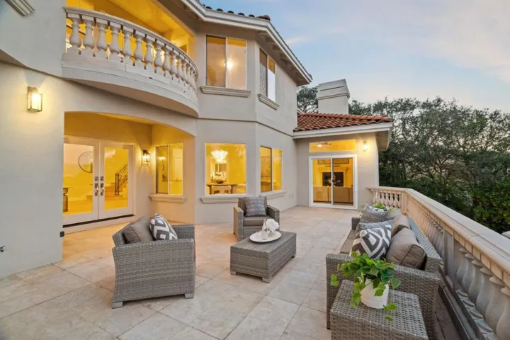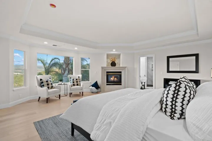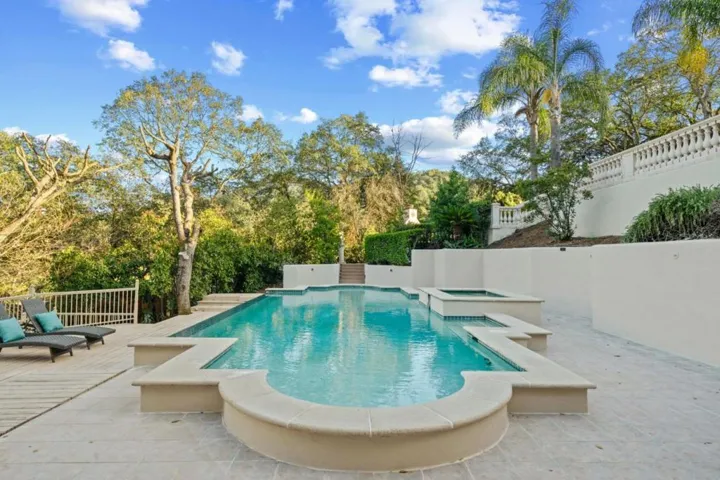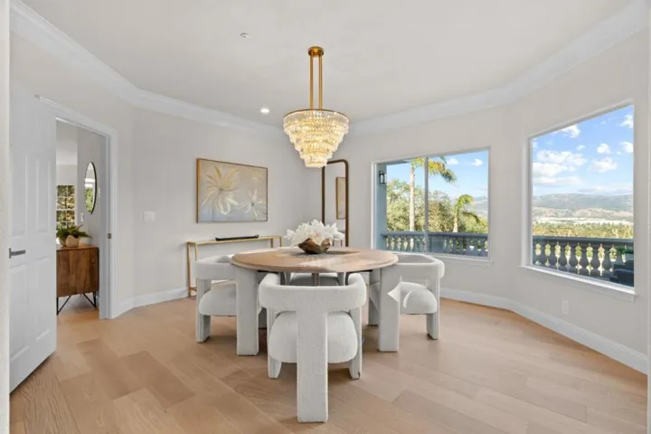Experience luxury living in this newly remodeled 5 bed/ 3 bath estate where timeless Mediterranean architecture meets modern sophistication. Set behind a private gate on a beautifully landscaped acre, this home offers sweeping city views, elegant interiors, and resort-style outdoor amenities. A grand foyer with stained-glass ceiling and crystal chandelier opens to formal living and family rooms, each with gas fireplace.The brand-new chefs kitchen features shaker cabinetry, quartz counters, a 6-burner Viking range, built-in Viking fridge and microwave, large island with bar sink, and walk-in pantry. Formal dining area with gorgeous chandelier and unobstructed views. Ground-floor bedroom and stylish full bath are perfect for guests. The expansive primary suite offers a balcony, fireplace, massive walk-in closet with island, and spa-style bath with dual quartz vanities, soaking tub, shower, and Toto smart toilet. 3 additional bedrooms plus an office/bonus room share an updated bath. Private-entry lower room is ideal for gym or studio. Resort-style grounds include an infinity pool with spa, 6-hole putting green, outdoor kitchen with fireplace and BBQ, rotunda with fountains, and multiple entertaining patios.3 Car Garage. Close to trails, wineries, and vibrant Downtown Morgan Hill.