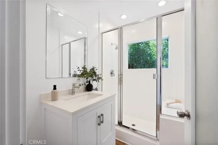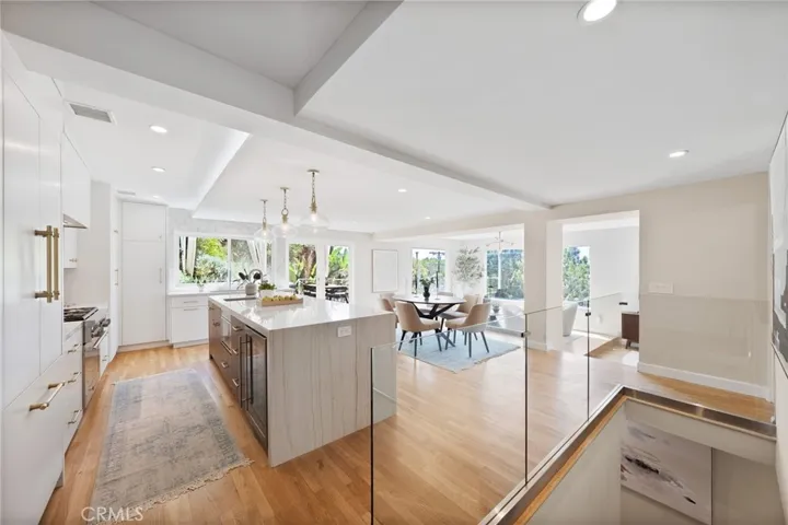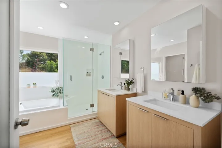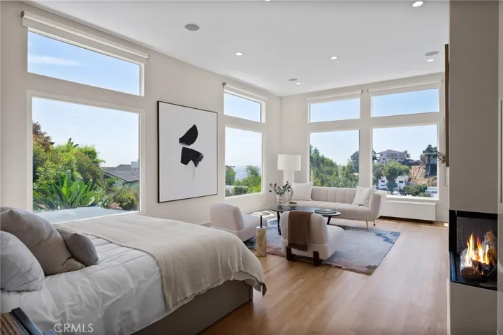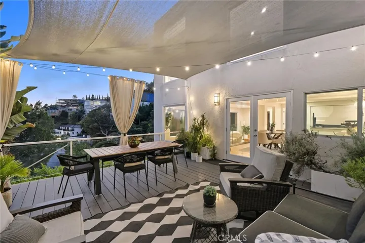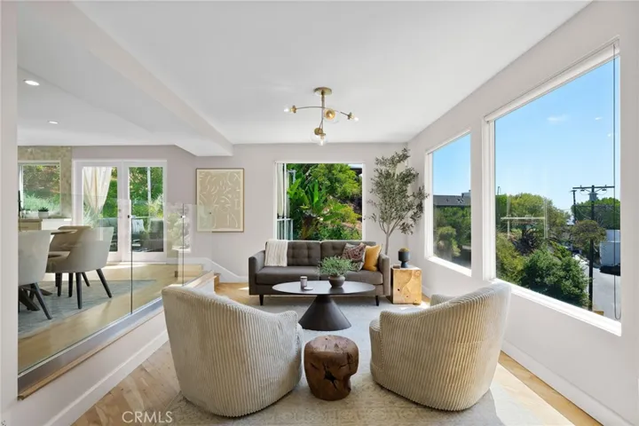 Tucked away in a peaceful, private setting, this contemporary retreat perfectly blends modern sophistication with the beauty of its Hollywood Hills surroundings. Designed with clean architectural lines and expansive glass walls, the home captures sweeping views of the city, canyons, and treetops. The open-concept living, dining, and kitchen areas connect seamlessly to a covered outdoor deck—an ideal space for both lively entertaining and quiet relaxation. The chef’s kitchen is a true centerpiece, anchored by an expansive waterfall island perfect for gatherings. Custom cabinetry with built in Appliances, quartz counters, and pocket lighting above the island, make this space as functional as it is beautiful. The main level also includes a versatile bedroom with its own en suite bath, perfect for guests, family, or a private retreat. Upstairs, the primary suite is a true sanctuary with soaring ceilings, a fireplace, spa-like bath with soaking tub and separate shower, and a private terrace. Two additional bedrooms, each with en suite bathrooms, provide comfort and privacy. Additional highlights include a dedicated office, stylish powder room, and direct garage-to-front-door access. Thoughtful upgrades throughout the kitchen and bathrooms enhance the home’s modern appeal. An OVERSIZED garage space with electricity that can easily be converted to a gym, music studio, Mud ROOM, or any extra space of your choice. Not to mention, Two driveway spots, and generous street parking, convenience comes easy. Just minutes from the Sunset Strip, Chateau Marmont, and other Hollywood icons, this residence offers both privacy and proximity to the best of Los Angeles living.