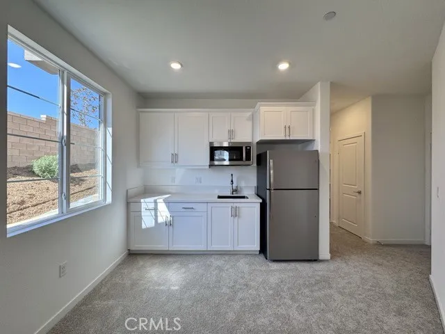 This charming 1 bedroom, 1 bathroom residence with its own private entrance offers a spacious and thoughtfully designed layout. Inside, you’ll find plush carpet flooring, a light and airy paint scheme, and an inviting living room that seamlessly opens to the modern kitchen. The kitchen is a true highlight, featuring stainless steel appliances, quartz countertops, and ample cabinetry for all your cooking needs. Down the hallway, enjoy the convenience of a spacious laundry room with storage, a full bathroom with a shower/tub combo, and an oversized primary suite complete with a private retreat area and a generous walk-in closet. The backyard is currently being completed with turf and fencing for added privacy making it perfect for relaxing or entertaining outdoors. As part of the Quartz Trail community, you’ll have access to fantastic amenities including a large grassy area, playground, picnic space, and pickleball court. This home is also conveniently located near shopping, dining, schools, parks, and offers easy access to the 215 freeway for commuters. Don’t miss out on this rare opportunity, schedule your showing today!