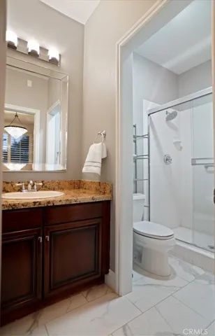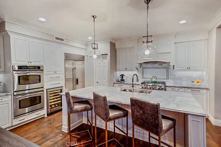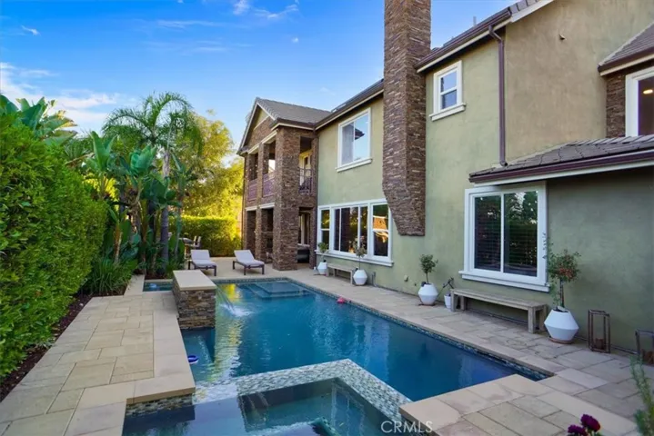 This magnificent home, located in Valencia’s prestigious Tesoro del Valle community, is a true showcase of luxury and craftsmanship. Built in 2004, this expansive single-family residence offers approximately 5,023 square feet of living space on a generous 8,462 sq ft lot, featuring 6 bedrooms and 6 bathrooms. Step inside to discover an atmosphere of elegance, highlighted by soaring ceilings, refined crown molding, and rich hardwood flooring that create a warm and inviting ambiance. The formal living room, accented by French doors that open to the front patio, flows seamlessly into a grand dining area—perfect for entertaining. At the heart of the home lies a gourmet kitchen, equipped with a custom marble tile backsplash, quartzite countertop, stainless steel appliances, a Sub-Zero refrigerator, Thermador microwave, GE Monogram stove, GE Profile double ovens, and a wine cooler. The kitchen opens to a bright breakfast nook and cozy den overlooking the backyard oasis. A convenient first-floor en-suite bedroom provides comfort and privacy for guests, complemented by a nearby powder room. Upstairs, four additional bedrooms include a luxurious primary suite with its own balcony offering scenic views, a spacious walk-in closet, dual vanities, solid marble slab shower walls, and a soaking tub. Two bedrooms share a Jack-and-Jill bathroom with travertine flooring, while another features its own private bath with marble walls. On the third level, a private suite includes a full bath and walk-in closet—ideal as a sixth bedroom, home office, theater, or playroom, offering exceptional versatility. The backyard retreat is designed for both relaxation and entertaining, featuring a sparkling pool, lush landscaping, and serene views. Additional highlights include a spacious 4-car garage, owned Tesla solar system, Tesla charger, whole-house water filtration and softener, and a gas-powered generator. Residents of Tesoro del Valle enjoy access to premium amenities, including a clubhouse, community pool, lake, sports fields, playgrounds, and more.