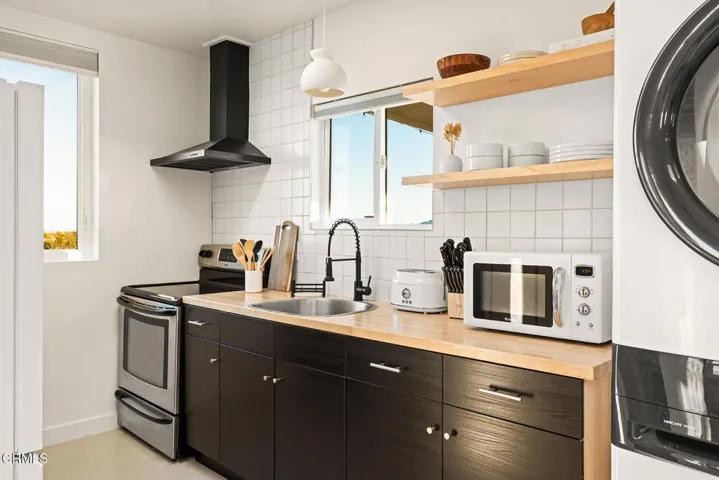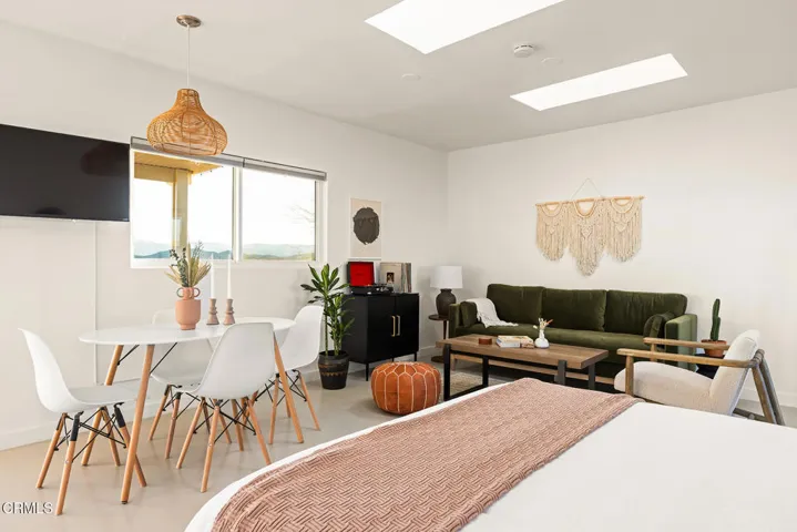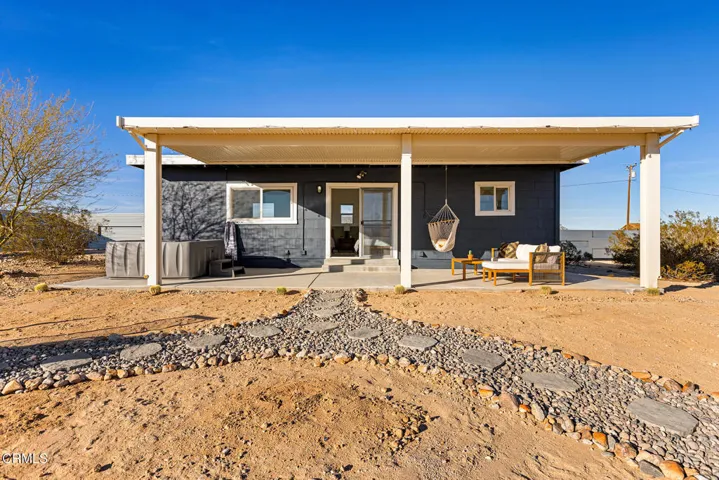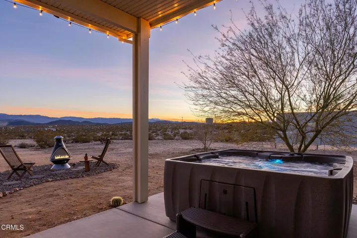 Desert charm meets modern comfort in this airy, open studio on the Copper Mountain Mesa. With sweeping views of Joshua Tree National Park and BLM land directly to the south, 67975 Presswood Rd offers privacy and tranquility with quintessential high-desert vibes. Built in 1959 and beautifully updated, the 592 square foot layout is filled with natural light from five large skylights and connects seamlessly to the outdoors. The previous owners completed a major renovation, converting this former homestead cabin into a Single Family Residence, and the kitchen and bathroom were also remodeled in 2023 with modern finishes and newer appliances, including a stove, refrigerator, and stackable washer/dryer. The open floor plan provides generous space and flexibility, with the potential to convert the layout into a one-bedroom design if desired. Enjoy desert living from the large covered patio–perfect for outdoor dining, stargazing, or soaking in the hot tub under the expansive desert sky. The property also features a fire pit, hammock, and thoughtfully landscaped grounds with desert willow, palo verde, and olive trees on a drip irrigation system. Fully furnished and move-in ready, this inviting desert retreat is ideal as a primary residence, weekend escape, or turnkey investment property.