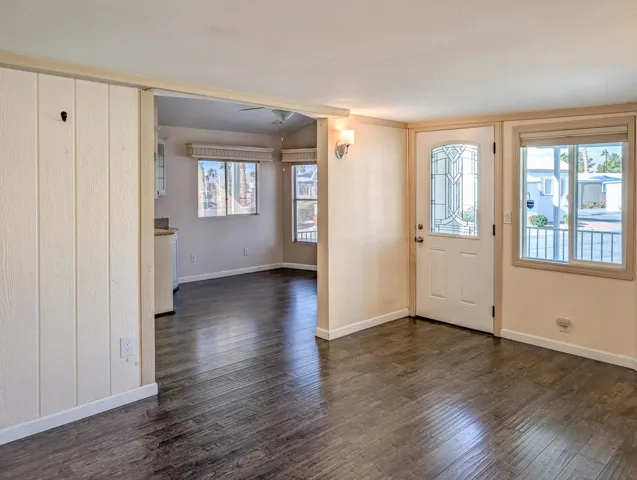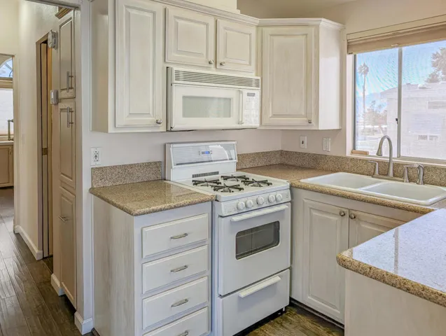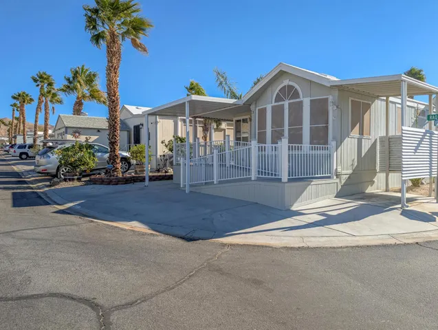 Nestled near the clubhouse and centrally located within the community hub, this delightful and meticulously maintained 1-bedroom, 1-bathroom 1996 Fleetwood Park Model offers approximately 800 square feet of comfortable living space. The home stands out for its thoughtful layout and appealing features, making it a perfect choice for those seeking both convenience and comfort in a vibrant resort setting. This stick-built residence offers the flexibility of adding a second bedroom, providing extra space for guests or hobbies. The kitchen is equipped with elegant granite countertops, while upgraded hardwood flooring runs throughout the home, enhancing its warmth and appeal. For added convenience, there is a private laundry room with washer and dryer hookups, a utility sink, and both ductless and standard HVAC systems for efficient heating and cooling. The jack & jill bathroom ensures easy access from multiple rooms, maximizing functionality. Step outside to a private, covered deck accessed via a ramp, offering a comfortable spot to relax and take in the picturesque views of the surrounding desert hills and mountains. The back of the property faces the first hole tee of the golf course, providing a tranquil and scenic backdrop. while proximity to sports courts and the driving range offers ample opportunities for recreation. Located within the luxurious 55+ Caliente Springs Resort, residents enjoy access to a wide array of amenities including a mineral hot spring pool and spas, a fitness center, a 9-hole golf course, pickleball courts, tennis courts, and a calendar full of organized community events designed for fun and social connection. This home is ideal as a primary residence or a relaxing getaway. Please note that the lot is not owned; the current space rent is $811.