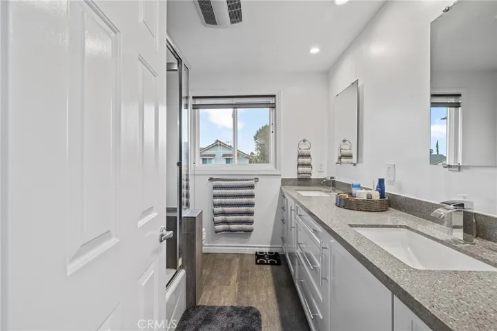 Heading to the second floor, you’ll find an extravagant master suite and a remodeled private bath with a walk-in closet, dual sinks, and a separate soaking tub, balcony enjoying the views. Bathroom upgrades include newer sinks, tubs, tile, and flooring. Your backyard features a pool and spa with a newer pool heater and variable-speed filter, a built-in BBQ, an adjustable-height basketball hoop, fruit trees, and a garden. Additional amenities include hardwood flooring, a split system HVAC with separate heat/cooling Mitsubishi units upstairs, a whole-house attic fan, and insulated garage doors.