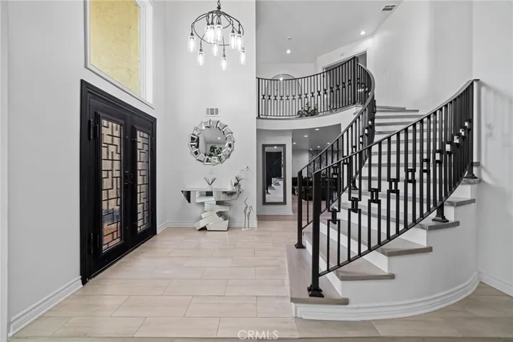 Walk inside through the double wrought iron doors, and you will be greeted by high-end designer wrought iron staircases—a true showstopper. To your right, high ceilings allow an abundance of light to brighten the living room, which leads to the formal dining room. The custom fireplace will not go unnoticed, and the picture-perfect window overlooks the lush landscaping.