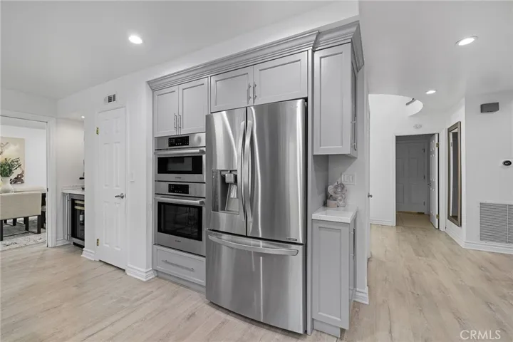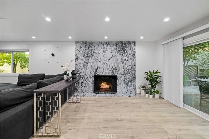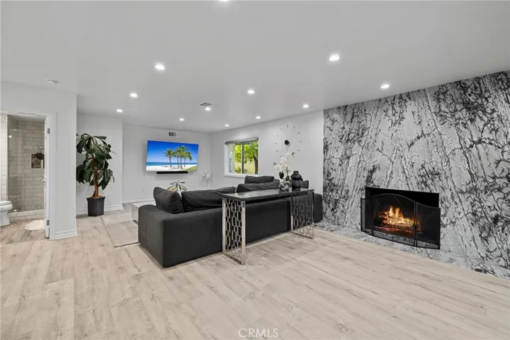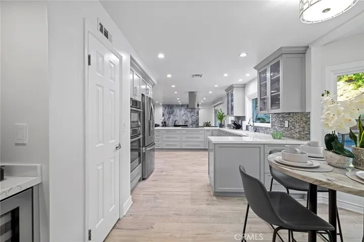 The open floor plan connects to a formal dining area and a beautifully updated kitchen featuring a large center island, custom backsplash, stainless steel appliances, and an eat-in area. The adjacent family room boasts a custom stone fireplace that complements the overall house design, adding an elegant touch.The huge remodeled kitchen showcases quartz countertops, an induction cooktop, custom cabinetry and backsplash, stainless steel Bosch appliances, a beverage center with a small U-line refrigerated cooler, an overhead cooking exhaust fan, an eat-in area, a walk-in pantry, and a breakfast bar.