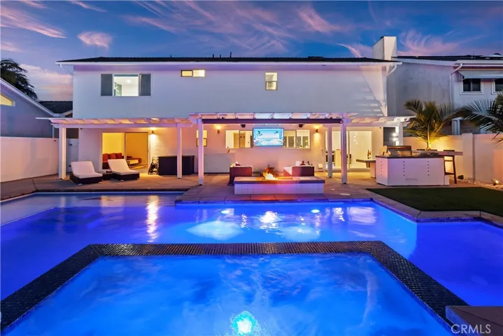 Welcome to this exceptional, renovated home blending high-end design, smart technology, and resort-style outdoor living. Located on a quiet interior street in the highly sought after Moffett tract, this home truly has it all. Every detail has been thoughtfully curated—from the reimagined front yard with lush landscaping, low-maintenance turf, new King palm, privacy fencing, and app-controlled irrigation system—to the stunning indoor and outdoor upgrades. The entry porch features stylish, no-slip tile, while the upgraded garage includes vinyl flooring, a smart door system, new water heater, and washer/dryer. Inside, the open-concept main level showcases heated Italian porcelain tile flooring and a show-stopping kitchen with a custom Italian quartz island, built-in convection oven, sensor glass cooktop, downdraft vent, microwave drawer, and sleek soft-close cabinetry in walnut and fingerprint-resistant gloss white. Under-cabinet LED lighting with app-controlled color options completes the modern aesthetic. Large sliding doors open to a true backyard retreat: a custom-built BBQ island with fridge, sink, gas grill, side burner, storage, ambient lighting, and two seating areas. Entertain with ease around the gas fire-pit or waterproof outdoor TV, or unwind in the state-of-the-art salt water pool and spa, featuring massage jets, a waterfall, Baja step, upgraded heater, and app-controlled lighting—all surrounded by lush landscaping and a new brick paver patio with a cozy daybed. The main floor includes a bedroom and beautifully updated bathroom with white marble-look tile, matte black fixtures, and a rain shower. Upstairs, the luxurious primary suite offers heated floors and a huge walk-in closet with custom built-ins and a frosted glass barn door. The spa-inspired bathroom features black porcelain tile, gold fixtures, a Kohler digital steam shower with six body sprays, bluetooth speakers, dual waterfall sinks, invisible drains, and floating walnut vanities with under-cabinet lighting. A third spacious bedroom includes an en suite bath, large closet, and sweeping views of the pool and Huntington Beach sunsets. This home also features a whole-house Sonos sound system (app-enabled) for seamless indoor and outdoor audio in the living room, primary suite, and patio. With so many features, this home is a must see and is the epitome of SoCal living near the beach, top-rated schools, shopping, dining, and entertainment.