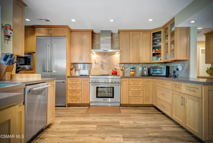 Welcome to this beautifully remodeled single-story home located in one of the most desirable and family-friendly neighborhoods of Calabasas. Thoughtfully updated throughout, this residence offers 4 bedrooms, 2.5 bathrooms, and 2,401 sq ft of living space on an approximately 9,000 sq ft lot — blending timeless style with functional design.Property will be shown by appointment only. Step through the charming front courtyard and into an open, light-filled floor plan featuring wide-plank flooring, recessed lighting, and elegant contemporary finishes. The warm and inviting interior is perfect for both everyday living and entertaining. The remodeled kitchen showcases quartz countertops, custom cabinetry, stainless steel appliances, and generous prep space — seamlessly connecting to the main living areas as the central hub of the home. The primary suite provides a peaceful retreat with a beautifully renovated ensuite bathroom, dual vanities, and a spacious walk-in shower, and a generous mega closet. Three additional bedrooms offer flexibility for family, guests, or a home office. One has been transformed into a stylish wine room, easily convertible back to a bedroom if desired. A sleek full bathroom and guest powder room complete the layout. The backyard is a true highlight — lushly landscaped with mature greenery that creates a serene retreat and complete privacy. Whether entertaining guests or enjoying a quiet evening outdoors, this tranquil setting offers both beauty and seclusion, serving as an ideal extension of the home’s living space. Outside, you’ll find your own private escape featuring a sparkling pool and spa with a newer heater, a built-in BBQ, covered patio, and plenty of seating — perfect for hosting gatherings or simply relaxing and embracing the coveted Calabasas lifestyle. Energy-efficient upgrades include a fully paid solar system with a Tesla Powerwall battery, providing both cost savings and backup energy security. Perfectly located just minutes from top-rated Las Virgenes schools, hiking trails, The Commons at Calabasas, and freeway access, this move-in-ready home offers the ideal balance of comfort, location, and lifestyle.