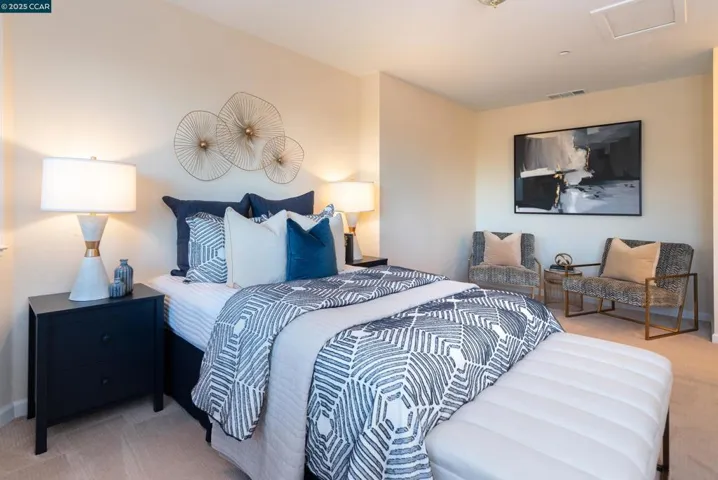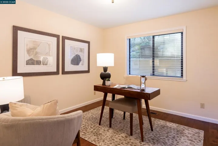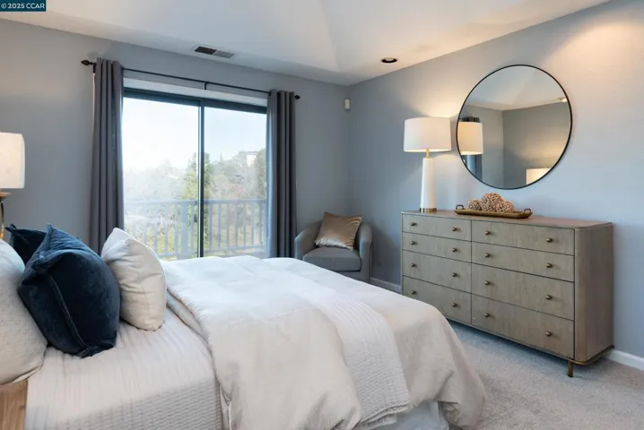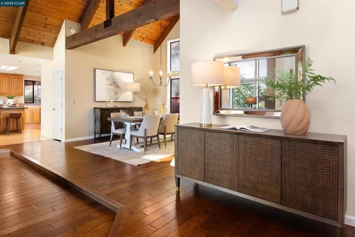 Welcome home to a serene hillside retreat overlooking the treeline in Walnut Creek’s Tice Valley and Castle Hill neighborhood. This elevated setting brings peaceful East Bay views, warm natural light and the classic charm of a mountain inspired escape. The Great Room features soaring cathedral-style vaulted ceilings with exposed wood beams and oversized picture windows overlooking the trees. A second living room centers around a cozy pellet stove fireplace that brings warmth and ambiance to every season. The kitchen features stone counters, a large island, skylight and built-in appliances with access to a wraparound mezzanine deck that captures expansive valley views from above the treeline. A ground-level suite includes its own bath and laundry ideal for guests, in-laws or multi-gen living. The primary suite offers two private decks, a jetted tub with a view and walk-in closet. Multiple view decks and landscaped gardens complete this tranquil retreat minutes to downtown Alamo or Walnut Creek, top Acalanes schools and scenic hiking and biking trails. Make this house your home! Seller to offer buyer a rate buy down and or credit toward buyer’s closing costs, certain terms apply.