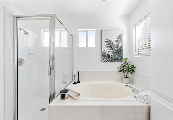 Step inside to find a light-filled loft-style living area with soaring ceilings, a dramatic matte black fireplace trimmed in natural wood, a statement waterfall chandelier in the stairwell, and wall-to-wall windows that overlook the sparkling pool. The downstairs half bath has been stylishly remodeled, and upstairs, both bedrooms enjoy full en-suite bathrooms, creating an ideal layout for privacy and comfort. The larger primary suite includes dual sinks, a soaking tub, separate walk-in shower, a sit-down vanity, a private water closet, and a generous walk-in closet.