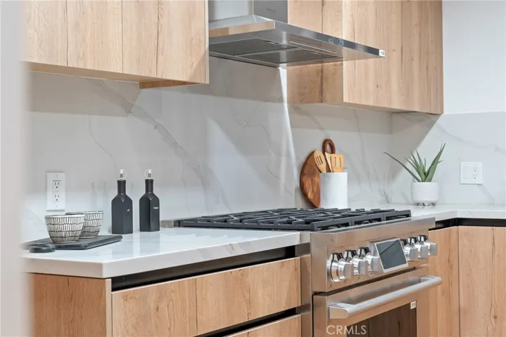 The main residence features three spacious bedrooms and three beautifully designed bathrooms. At the heart of the home is a chef’s dream kitchen, outfitted with brand-new Signature appliances, custom oak cabinetry, Bedrosians Calcatta Milan quartz countertops, and a striking Brussels Blue quartz island.