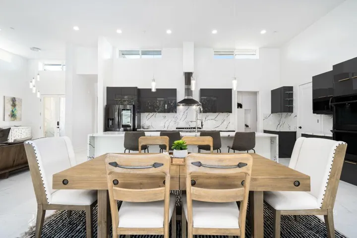 El Paseo shopping district, this nearly new custom home blends artistic style and opulent luxury in a generous single-level design. A private cul-de-sac homesite of nearly 10,019 s. f. reveals a pool and spa, custom mural, a fireplace and built-in BBQ. Custom etched-glass entry doors open to a spacious and welcoming great room that looks out to the pool and mural through massive slide away glass doors. Crowned by a high ceiling with clerestory windows, this fabulous space combines a living room with linear fireplace and custom built-ins, a dining room with wet bar, and a stunning European-inspired kitchen with custom high-gloss cabinetry, an oversized double-waterfall island with seating, quartz countertops, a full backsplash, walk-in pantry, and black-stainless Samsung appliances including a double-oven, French-door refrigerator and five-burner cooktop. Approximately 3,755 square feet, the home ensures comfort and privacy with five ensuite bedrooms and six baths. One bedroom is ideal for guests and boasts a kitchenette, washer and dryer and separate entrance. The primary suite opens to the outdoors via three sets of French doors and hosts a bar with wine refrigerator, a freestanding tub, walk-in rain shower, walk-in closet and LED mirrors. Embellishments throughout the residence include custom glass doors and shower enclosures, large-format porcelain tile, on-trend LED lighting fixtures, art niches and more. Flex Solar on property.