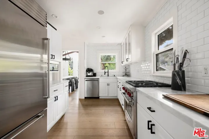 Tucked away on a quiet cul-de-sac, this 1923 Spanish Colonial with a Tuscany Flair blends timeless character with modern comforts, offering the perfect balance of privacy and convenience just moments from the Sunset Strip and iconic Chateau Marmont. Elevated above the street and framed by majestic trees, the home feels like a true retreat while staying connected to the vibrant heart of Los Angeles. Each of the three bedrooms opens directly to its own outdoor space, creating seamless indoor-outdoor living ideal for both quiet relaxation and inspired entertaining. Sunlight fills the interiors, highlighting original architectural details that harmonize beautifully with recent upgrades. Freshly painted inside and out, the home features restored wood floors, tile-accented foyers and terraces, and newly installed mahogany entry and garage doors that add warmth and craftsmanship. The updated kitchen is a chef’s delight with marble countertops, a Wolf range, and a Sub-Zero refrigerator. The garage has been thoughtfully converted into a luxury gym, also perfect for a private office or studio. Modern upgrades, enhanced wiring, and a built-in gas grill make everyday living effortless. A terrace and private deck offer serene outdoor escapes with stunning sunset views, surrounded by trees that create a tranquil, retreat-like environment. Just minutes from world-class dining, entertainment, and culture, walking distance to the Sunset Strip. This rare offering captures the essence of Laurel Canyon living, a sanctuary of history, beauty, and comfort in one of Los Angeles’s most iconic neighborhoods.
