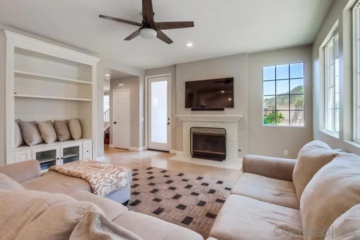 Welcome to 425 Camino Hermoso – Beautiful 4BR/3.5BA home in the gated Belleza community. Bright open floor plan with tile flooring downstairs and hardwood upstairs. The living area features recessed lighting and a cozy fireplace, flowing seamlessly into the dining area and modern kitchen with stainless steel appliances, granite counters, a large center island, and ample cabinetry. The primary suite offers a walk-in closet and ensuite with dual sinks, a soaking tub, and a separate shower. An optional second primary suite (currently used as a spacious bonus room) includes its own ensuite bath—perfect for guests or extended family. Two additional bedrooms share a full hall bath. Enjoy the private backyard with a paved patio, lush landscaping, and no rear neighbors. Additional highlights include solar panels, central A/C, upstairs laundry, and a 2-car garage. Low HOA dues and a prime location close to top-rated schools, parks, trails, and CSUSM.