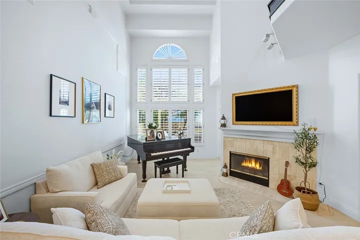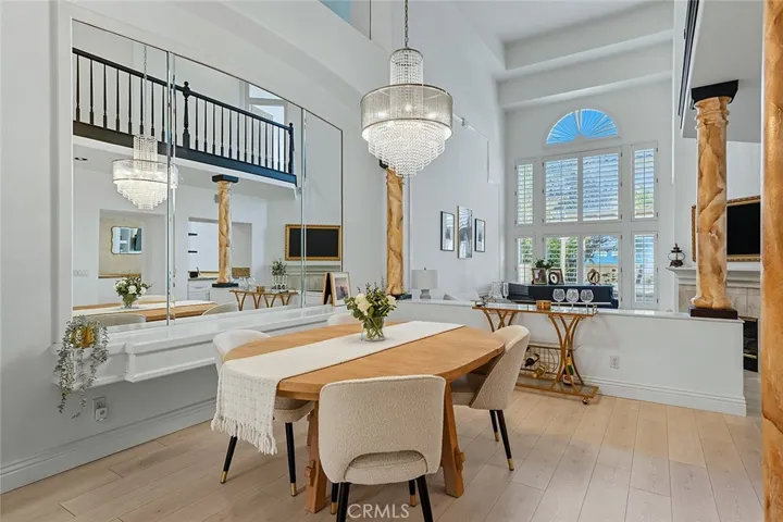 Inside, you’re greeted by dramatic 18-foot ceilings, a grand curved staircase, and expansive windows that fill the home with natural light and create an open, airy ambiance. The formal living room is highlighted by a fireplace and soaring two-story windows, while the adjacent dining room showcases elegant architectural columns and mirrored accents.