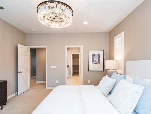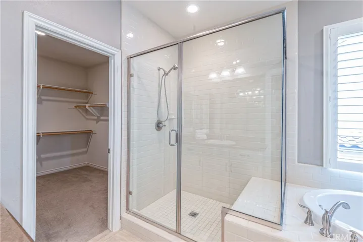 The primary suite offers a serene atmosphere with a soft, neutral palette, elegant chandelier, and an abundance of natural light. The ensuite bath features dual vanities, a deep soaking tub, a newly installed glass shower enclosure, and a large walk-in closet. Two secondary bedrooms enjoy beautiful light and generous closet space, complemented by a shared full bath with dual sinks and a convenient upstairs laundry room with extra storage.