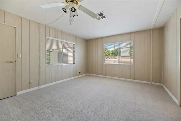 Welcome to Palm Desert Greens Country Club, one of the desert’s most sought-after guard-gated 55+ communities offering a vibrant lifestyle at an incredible value! This spacious Golden West triple-section manufactured home boasts 3 bedrooms and 2 baths across a spacious, light-filled layout. It’s a fantastic opportunity for buyers looking to enjoy resort-style living without breaking the bank. Step inside to find new carpet, updated cabinet pulls, and thoughtful touches throughout that make the home feel fresh and move-in ready. The open living and dining areas are ideal for entertaining or relaxing, and the kitchen offers plenty of cabinet and counter space. A large shed in the backyard provides extra storage or hobby space, always a bonus! Outside, you’ll love the low-maintenance lot plus easy access to community amenities just minutes away. For just $400 per month, your HOA dues include unlimited golf on the 18-hole executive course, along with access to three community pools and spas, tennis and pickleball courts, a fitness center, bocce, shuffleboard, and a lively clubhouse with restaurant and bar. Palm Desert Greens is centrally located near El Paseo shopping, dining, and entertainment, offering the perfect blend of relaxation and recreation. Whether you’re seeking a full-time residence or a seasonal desert escape, this home delivers the lifestyle so many are searching for at a fabulous price of $285,000! Come see why Palm Desert Greens remains one of the best values in the Coachella Valley for golf lovers and active adults alike. Some images have been virtually staged to show potential furniture placement.