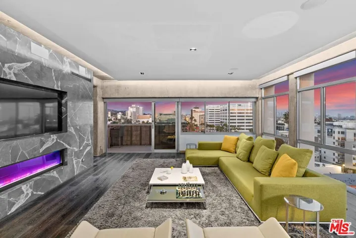 Imagine for yourself an enviable lifestyle of luxury and convenience. This immaculate full-service, luxury hi-rise prominently featured on hit TV shows, Hollywood Versailles Tower is situated in the most famous locale on planet Earth: Hollywood, California. Your claim to this remarkable property is Residence 802, situated in the premier line of the building, flaunting irreplaceable Eastern city lights views towards LA’s Times Square: Hollywood & Highland, and massive Southern views across the basin. Rebuilt by its present owner with unrivaled quality and craftsmanship, this condominium space has been masterfully designed from a legal two-bedroom into an oversized one-bedroom. Your kitchen is a chef’s showpiece featuring appliances by Sub-Zero and Wolf, which complement the hand-crafted custom cabinetry and showstopping book-matched Blackhorse marble island with waterfall edges and a bar counter. Each bathroom boasts Franz Viegener plumbing fixtures, tasteful Gallery Glass tiling from Ann Sacks and black Marquina granite, reminiscent of an opulent resort. The soundproofed flooring is covered by seven-inch plank, engineered, wire-brushed Duchateau Oak wood floors. Your private balcony awaits just beyond a pair of matching Fleetwood sliders that glide apart to reveal the pulse of Hollywood Boulevard. When it is time to wind down, motorized shades effortlessly close with a simple request to ‘Alexa’, and the built-in surround sound system comes to life, while you relax in front of the Amantii heated fireplace. European ‘Nora’ lighting fixtures allow you to customize your lighting settings to fit the mood. Lutron dimmers control nearly every light fixture. Laundry hookups are installed in a discreet closet. No expense was spared to create this professionally-designed residence. Hollywood Versailles Tower welcomes residents with a modern, redesigned lobby, 24-hour doorman/concierge and valet parking. Also included outside are a heated, remodeled outdoor pool and sundeck with barbecue and fire pit, a fitness center, dog run, electric vehicle chargers, and a multi-purpose recreation room. Hollywood Versailles Tower holds significant reserve funds. The quality and luxury of this property can only truly be experienced in person. Please call for a private appointment, no open houses are planned.