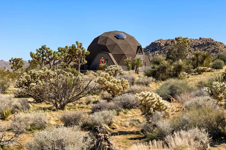 This architectural jewel sits amidst Joshua Trees on over two acres in Upper Friendly Hills. 7677 Wilton Rd is a striking Buckminster Fuller-inspired geodesic dome with soaring ceilings, dramatic skylights, and stunning views of the surrounding mountains and desert. The lower level welcomes you with bamboo flooring and a bright, open layout that flows between the living, dining, and kitchen areas. The kitchen features colorful accents and stainless steel appliances, while the spacious primary suite offers a generous bedroom, large closets, and an en-suite bath. A spiral staircase leads to the lofted second level, where two additional bedrooms with unique triangular windows overlook the grounds. A modern bath showcases designer tile and dual sinks, and a flexible bonus room provides extra living space. Designed to capture natural light and frame the desert sky, the dome’s wooden hexagonal details and abundant skylights create a uniquely beautiful atmosphere. Outdoors, the property offers a wraparound deck for al fresco dining, a propane fire pit, and a hot tub perfect for stargazing. With thoughtful upgrades including a newer roof, windows and sliding doors, an updated AC condenser, refreshed baths, and a newer hot water heater, this extraordinary home blends architectural wonder with modern comfort. Whether envisioned as a serene family retreat or a one-of-a-kind vacation escape, this desert dome presents the rare opportunity to live inside a work of art.