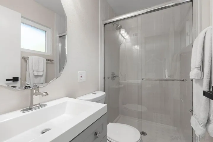Stunning and rare home in the heart of this highly desirable Clairemont neighborhood. Redesigned and move in ready. This home features an ensuite bedroom on the main floor plus two additional bedrooms with another full bath and an upper level primary suite with two walk in closets, gorgeous primary bathroom plus a two car garage. Enjoy newer windows, easy care turf lawns in the front and backyard, and a gorgeous kitchen with custom island, stainless appliances, modern lighting, beautiful tile backsplash, modern light fixtures and gas cooking. The open floor plan includes a spacious living room with fireplace and three fully updated custom designed bathrooms. The incredible, very private backyard is perfect for entertaining with a large covered patio and ample outdoor lighting to enjoy year round. Conveniently located minutes from parks, schools, restaurants, beaches, and shopping. Experience the best of San Diego living in a wonderful neighborhood. Stunning and rare home in the heart of this highly desirable Clairemont neighborhood. The absolutely gorgeous kitchen is a true showpiece featuring a custom island, stainless appliances, modern lighting, beautiful tile backsplash, gas cooking, and excellent storage space. Redesigned and move in ready, this home offers an ensuite bedroom on the main floor plus two additional bedrooms on the main level and an upper-level primary suite with two walk in closets and a luxurious remodeled bath. Enjoy newer windows and sliding doors, easy care turf lawns in the front and backyard large enough for play areas, and an open floor plan with a spacious living room centered around a striking fireplace and large hearth. All three bathrooms have been fully updated and custom designed. The private backyard is perfect for entertaining with a large covered patio and outdoor lighting for year-round enjoyment. Conveniently located minutes from parks, schools, restaurants, beaches, and shopping, this home captures the best of San Diego living.