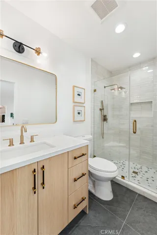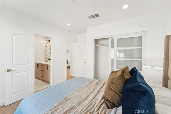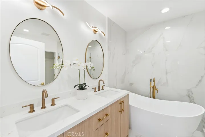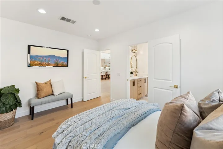 This completely redesigned and remodeled single-story home offers luxurious finishes throughout. Hard wood floors greet you as you enter the living area of a light and bright open floor plan. Enjoy dinners in your lovely dining room, conveniently situated next to the kitchen. This kitchen screams sophistication with sleek flat panel cabinets, quartz countertops, a walk-in pantry, 9 ft. waterfall island with chic pendant lights, a stunning backsplash, and stainless-steel appliances that are all included! Relax in the living room featuring an eye-catching accent wall and french doors with access to the backyard. Down the hall is a powder room and a separate laundry room with a washer, dryer and ample cabinet storage. This home offers 4 bedrooms including 2 primary suites, all with direct bathroom access. The first primary suite is the largest with french doors that open to the backyard, and an ensuite bathroom that is to die for. This bathroom has elegant tilework throughout, a dual sink flat panel vanity with quartz countertop, free-standing tub, magnificent walk-in shower, and a spacious walk-in closet. The second primary suite has a unique fireplace, preserving a piece of the home’s original charm. Its ensuite bathroom has a beautiful tile walk-in shower, tile floors, and a flat panel vanity with quartz countertop. A Jack & Jill bathroom sits between the 2 remaining bedrooms with an alluring accent wall, flat panel dual sink vanity and a divinely tiled tub/shower. A detached garage is at the rear of the home and is equipped with an electric car charger and epoxy floor and can be converted to ADU. The backyard has a new deck and enough room for kids/pets to play comfortably. This property is as close to a new built home as you can find, taken down to the studs and completely refinished (with permits). Come fall in love with it today!