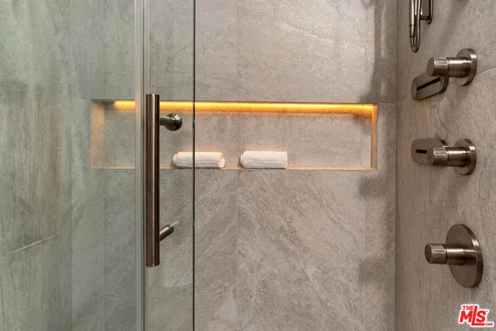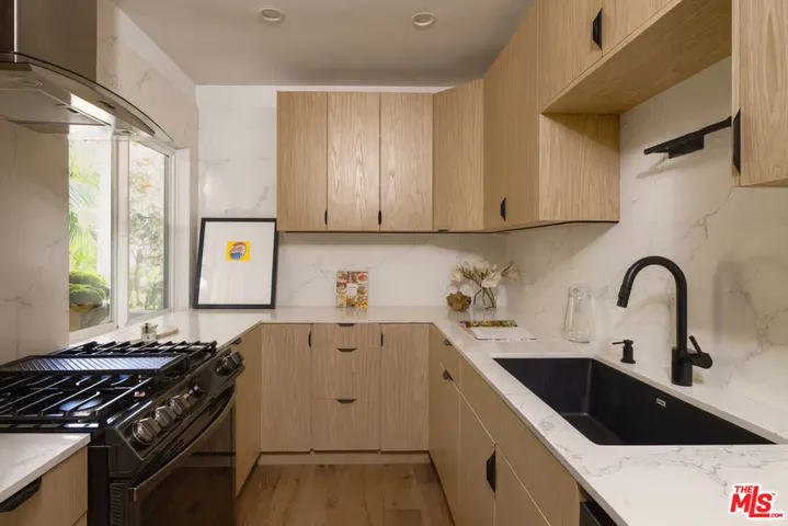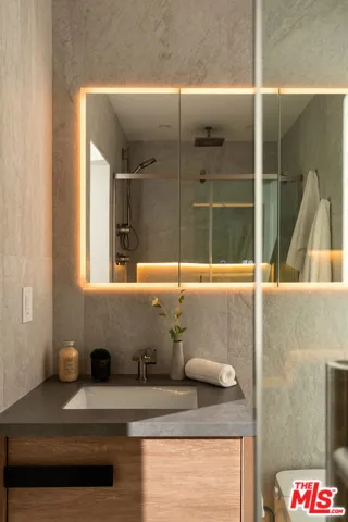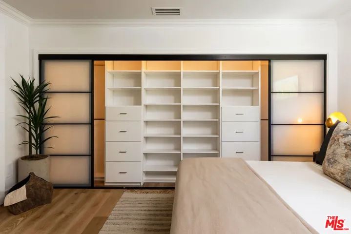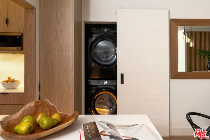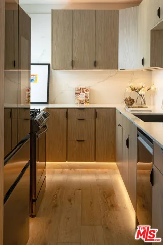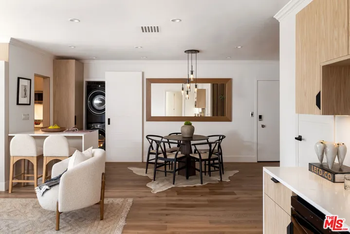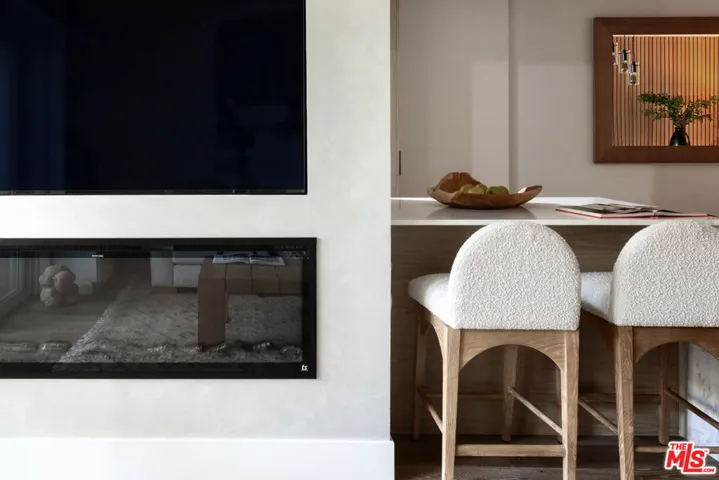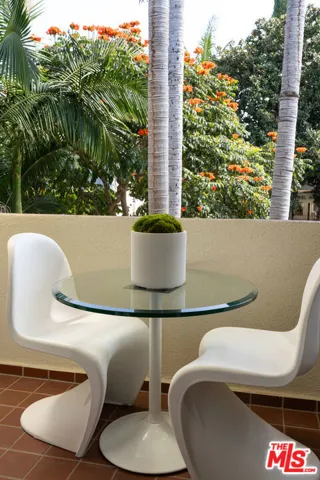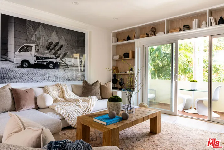 Perched on the top front corner of a classic mid-century building, this rarely available stunning 2Bed/2Bath condo captures the essence of refined West Hollywood living! Bathed in natural light and enjoying exceptional privacy with no adjacent neighbors on 2 sides, the home overlooks graceful palm and tulip trees and opens to a serene balcony retreat- an ideal setting for morning coffee or evening gatherings. *** Completely reimagined with a thoughtful and welcoming sense of design, the fully remodeled curated interior feature French white oak flooring throughout and a seamless open layout. The chef’s kitchen is a true showpiece, with custom underlit white oak cabinetry, warm Caesarstone countertops, and top-of-the-line appliances. A waterfall peninsula offers additional seating and a large passthrough balcony window ensures a brightly lit kitchen and frames views of the lush balcony. Seamlessly connecting to the outdoor patio, the living room features a custom built-in bookcase that transitions into a stunning Venetian plastered wall unit perfectly framing a 65″ flat-screen TV and contemporary fireplace (with adjustable ambient settings). The adjacent stylish dry bar, with custom underlet cabinetry, enhances the space, while the dining area’s cozy corner nook offers versatility as an intimate lounge or home office. *** The primary suite is a truly light and bright retreat, featuring custom Japanese-inspired screen closet system and beautifully designed built-ins that will be the envy of all. The ensuite bath evokes a spa-like ambiance with a floating vanity, bidet toilet, limestone-inlaid walls, and a generous walk-in shower, all adorned with designer trim-work and lighting. The secondary bedroom is equally spacious and includes a fully customized closet, while the hall bath feels like a boutique hotel suite with elegant finishes and a step-in shower. ***Beyond the residence itself, the building embodies the effortless elegance of its mid-century heritage. Residents are greeted by a terrazzo-lined lobby while the central courtyard pool is surrounded by palms, cushioned lounges and sitting areas, offering a perfect escape reminiscent of quintessential Palm Springs. It’s a place that feels as welcoming as it is stylish! *** Additional highlights include in-unit laundry, Eero wifi and smart home control system, upgraded LED lighting, custom doors and trim work throughout, HVAC, custom storage cabinetry, rare two side-by-side parking spaces with universal electric charger, and a level of detail and craftsmanship that sets this home apart from any other. *** Perfectly situated in one of West Hollywood’s most sought-after and convenient locations, this quiet street, top-floor corner residence blends thoughtful design, comfort, and timeless mid-century character in one exceptional offering.
