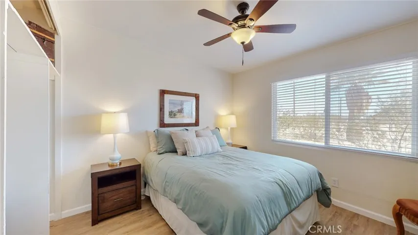 Experience desert living at its finest in this bright and airy, recently updated mid-century home located just minutes from the main entrance of Joshua Tree National Park. Situated on five peaceful acres, this property offers privacy, panoramic desert views, and tranquility that makes desert living so special. The home features an efficient galley kitchen that opens to inviting living spaces, including a dining area and spacious living room filled with natural light. There are two comfortable bedrooms, an updated bathroom, and new flooring throughout. A versatile bonus/sunroom provides additional space for a home office, studio, or guest accommodations. Enjoy the expansive covered patio, perfect for entertaining or simply relaxing under the desert stars. Conveniently located near Joshua Tree Village, 29 Palms Marine Base, Tortoise Rock Casino, local restaurants, and shopping—this home offers the ideal balance of peaceful seclusion and easy access to amenities.