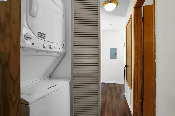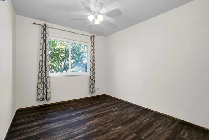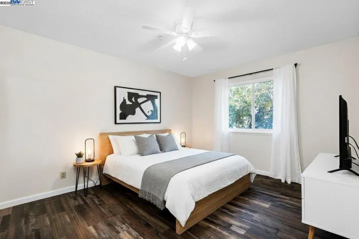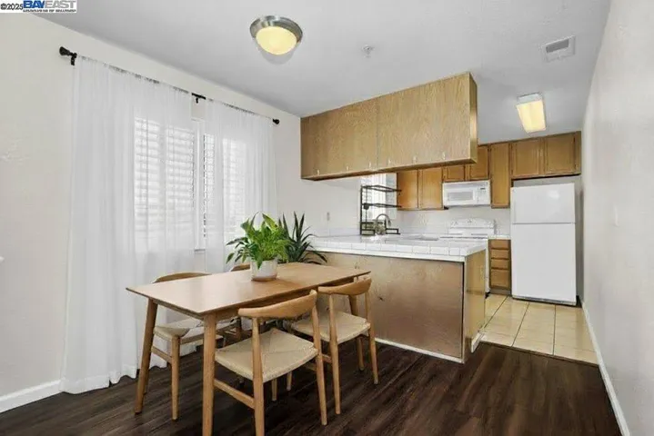 Welcome to this cozy and affordable home, nestled in a secure gated complex on a quiet street. Conveniently located near local freeways and within walking distance to the BART station, this home offers the perfect mix of tranquility and accessibility. Inside this second-level unit, you’ll find an open floor plan with laminate and tile flooring, creating a practical and inviting living space. The kitchen features tile countertops, ample cabinet storage, and a functional layout perfect for meal preparation. A sliding glass door fills the space with natural light and leads to a charming patio—great for relaxing, adding greenery, or accessing the extra storage closet. The unit includes a laundry closet with a washer and dryer for added convenience. Both bathrooms are updated with modern cabinetry, sleek countertops, and marble flooring. The master bedroom features a walk-in closet, offering plenty of storage. You’ll also enjoy two assigned parking spaces, one of which is covered. This delightful home is a wonderful opportunity to settle into a space that feels truly yours.