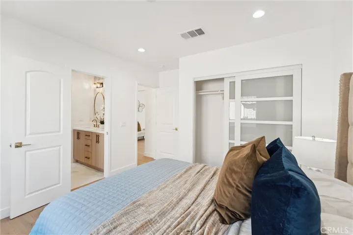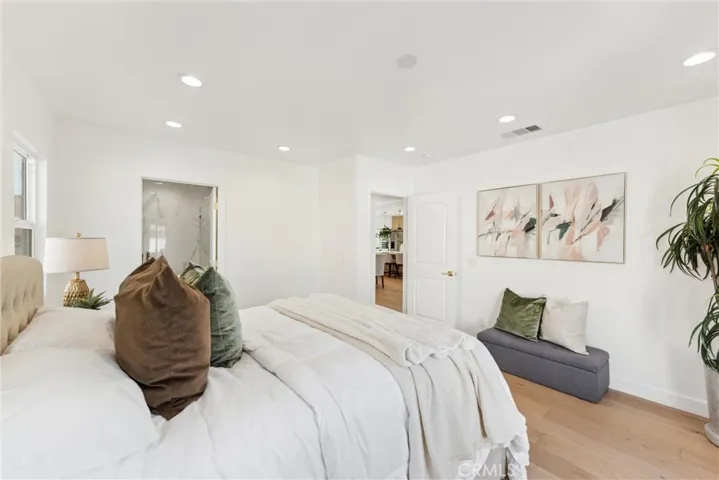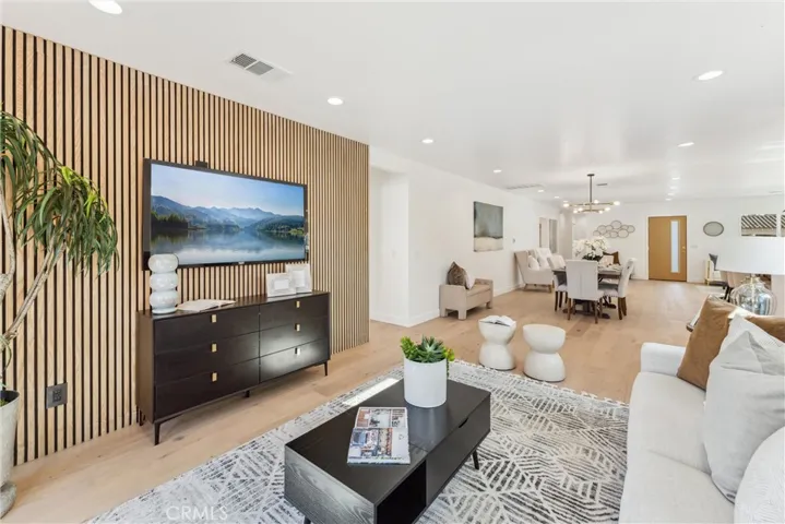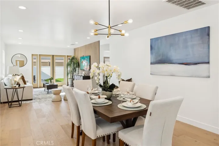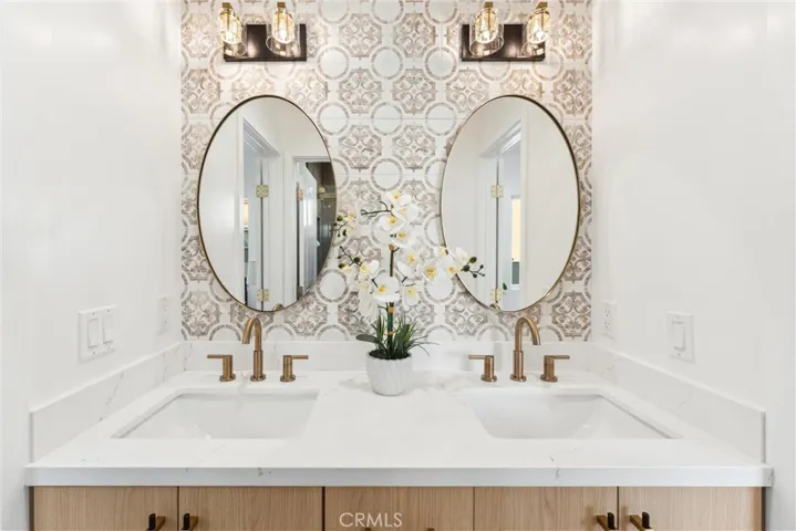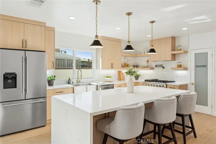 This completely redesigned and remodeled single-story home offers luxurious finishes throughout. Hard wood floors greet you as you enter the living area of a light and bright open floor plan. Enjoy dinners in your lovely dining room, conveniently situated next to the kitchen. This kitchen screams sophistication with sleek flat panel cabinets, quartz countertops, a walk-in pantry, 9 ft. waterfall island with chic pendant lights, a stunning backsplash, and stainless-steel appliances that are all included! Relax in the living room featuring an eye-catching accent wall and french doors with access to the backyard. Down the hall is a powder room and a separate laundry room with a washer, dryer and ample cabinet storage. This home offers 4 bedrooms including 2 primary suites, all with direct bathroom access. The first primary suite is the largest with french doors that open to the backyard, and an ensuite bathroom that is to die for. This bathroom has elegant tilework throughout, a dual sink flat panel vanity with quartz countertop, free-standing tub, magnificent walk-in shower, and a spacious walk-in closet. The second primary suite has a unique fireplace, preserving a piece of the home’s original charm. Its ensuite bathroom has a beautiful tile walk-in shower, tile floors, and a flat panel vanity with quartz countertop. A Jack & Jill bathroom sits between the 2 remaining bedrooms with an alluring accent wall, flat panel dual sink vanity and a divinely tiled tub/shower. A detached garage is at the rear of the home and is equipped with an electric car charger and epoxy floor and can be converted to ADU. The backyard has a new deck and enough room for kids/pets to play comfortably. This property is as close to a new built home as you can find, taken down to the studs and completely refinished (with permits). Come fall in love with it today!