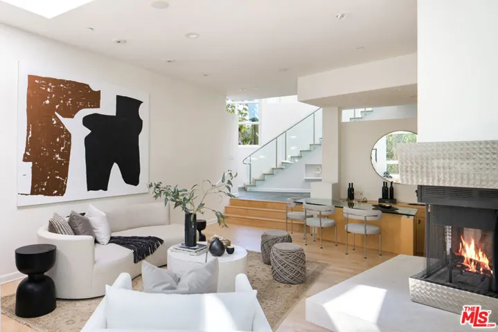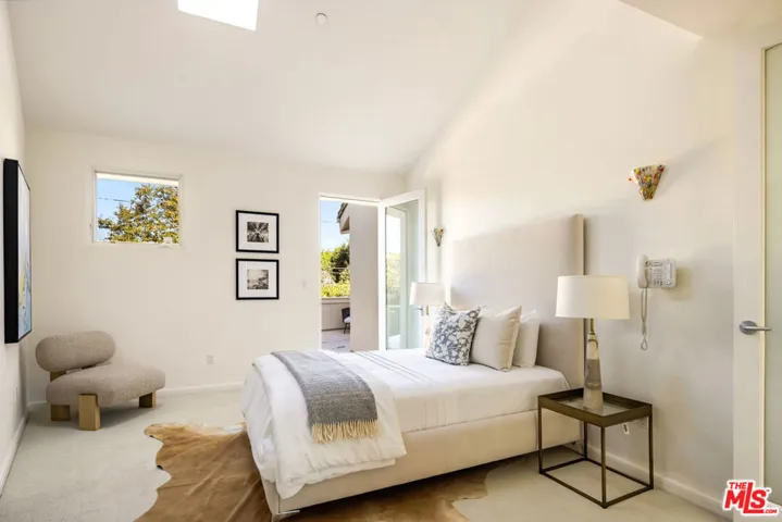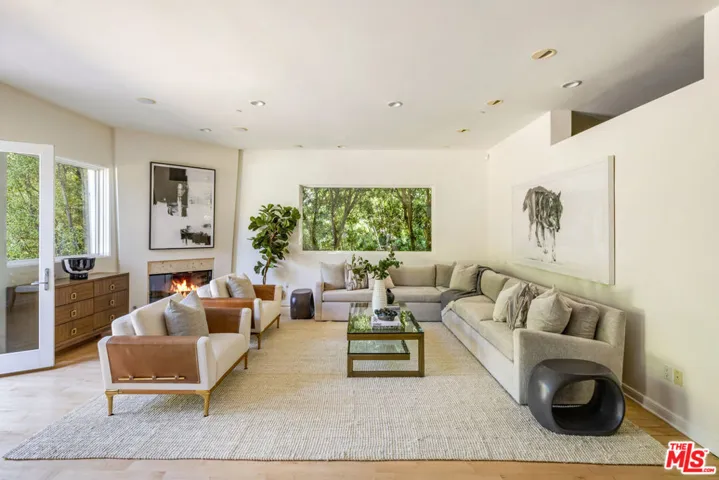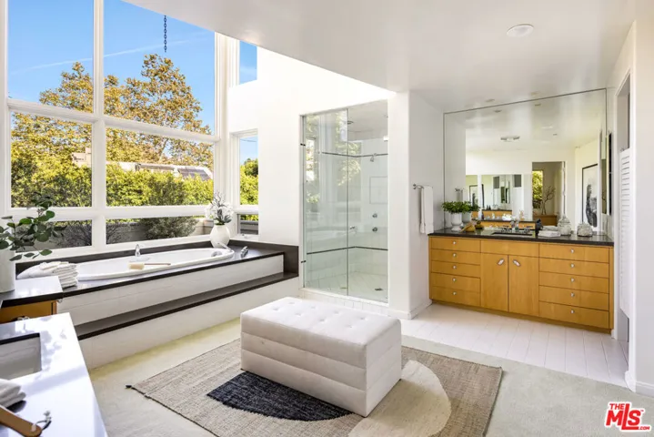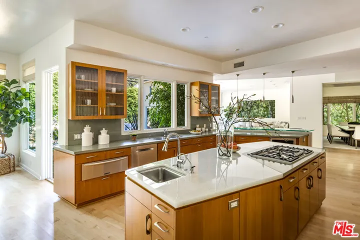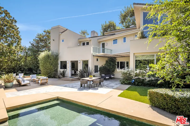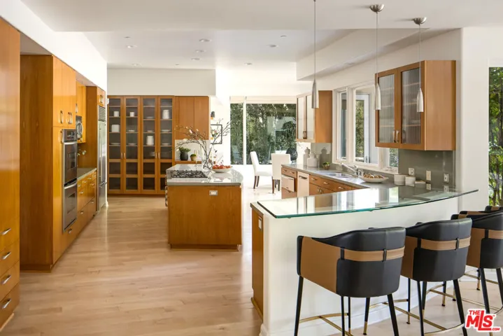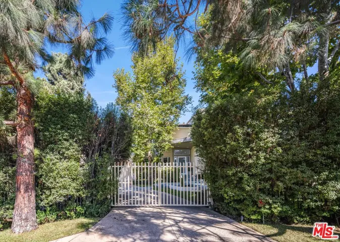 Tucked away in a quiet and picturesque nook of Brentwood Park south of Sunset, in close proximity to the Brentwood Country Mart, lies this warm, yet striking custom-built Contemporary done by the current owner. Set behind tall hedges and gates amidst towering trees, this uplifting, sun-filled home offers the very best California lifestyle. Open free-flowing floor plan, clean lines, lofty spaces with soaring ceilings all bathed in natural light, walls of glass, wonderful indoor-outdoor flow, wrap-around gardens, and great privacy & quiet. Wonderful drama, detail and quality of workmanship and materials throughout. Grand scale entry with sweeping stair and awe-inspiring voluminous ceiling leads to step-down formal living room with bar, formal dining room and library/den with built-ins and private bath. Expansive cook’s kitchen, sunny breakfast room and spacious family room with fireplace all overlook and open to fabulous private yard with ample patios for entertaining, sparkling pool, spa with children’s wading area and two grassy areas. Four spacious bedrooms upstairs, each with its own bath, including exceptional owner’s suite with generous sitting area, fireplace, terrace, lavish bath and room size walk-in closet, plus a downstairs guest bedroom. Other features and amenities include maple hardwood and stone floors, extensive built-ins, and an oversized three-car garage. A truly extraordinary home with distinctive design in the very finest Brentwood neighborhood– close to world class shopping and restaurants.