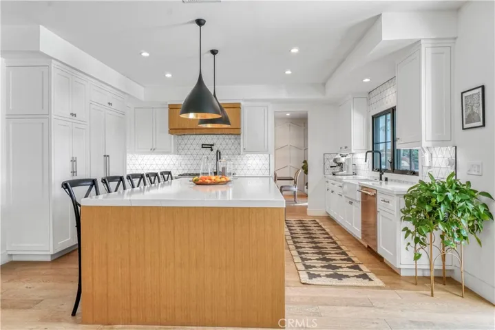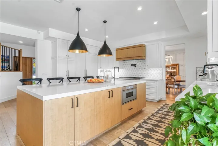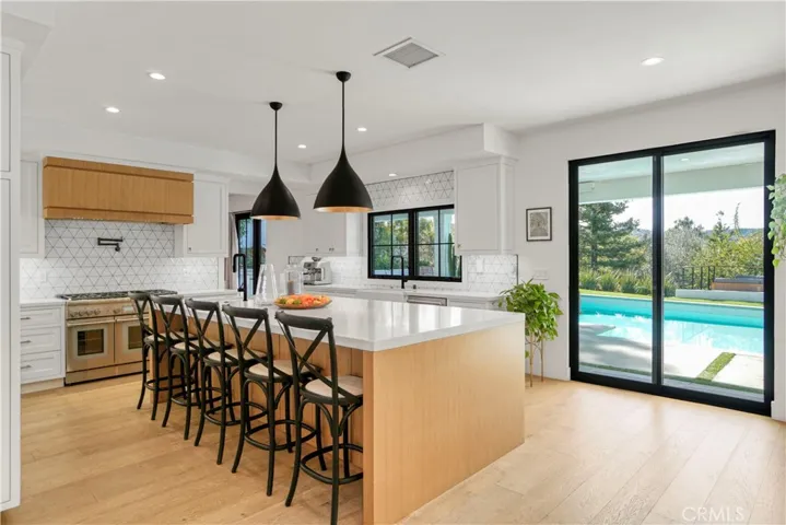Nestled in the quiet and serene neighborhood of Encino Hills and surrounded by mature trees, this recently and completely renovated home offers stunning views and a thoughtfully designed floor plan featuring five spacious en-suite bedrooms, a powder room and library that could also function as a playroom. The expansive primary suite includes a large walk-in closet and a peaceful seating area, creating a true retreat. A beautiful wooden deck on the second floor, extending across the length of the house, provides a panoramic viewing point. The gourmet kitchen boasts high-end stainless steel appliances and custom cabinetry, complemented by abundant natural light throughout the home. Set on nearly half an acre, the property features a sparkling pool and jacuzzi—both with new tile and plaster—a dedicated dog run, fruit trees, and a vegetable garden. The yard is thoughtfully divided into several seating areas, perfect for relaxation and entertaining. Additional highlights include a three-car garage, integrated smart home technology for convenience and security, and a community tennis court. Elegant interior finishes evoke a relaxed yet refined atmosphere. This home is perfect for entertaining or simply relaxing and enjoying the serene surroundings.
