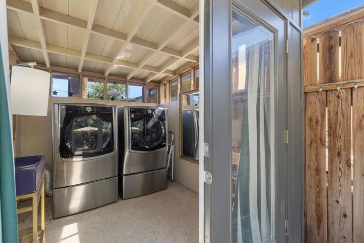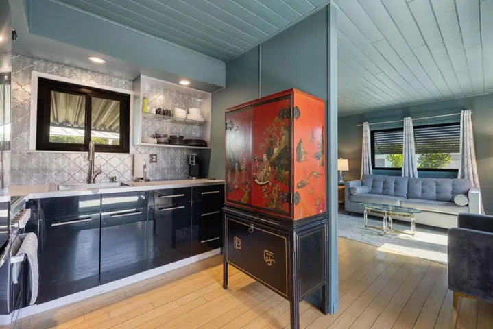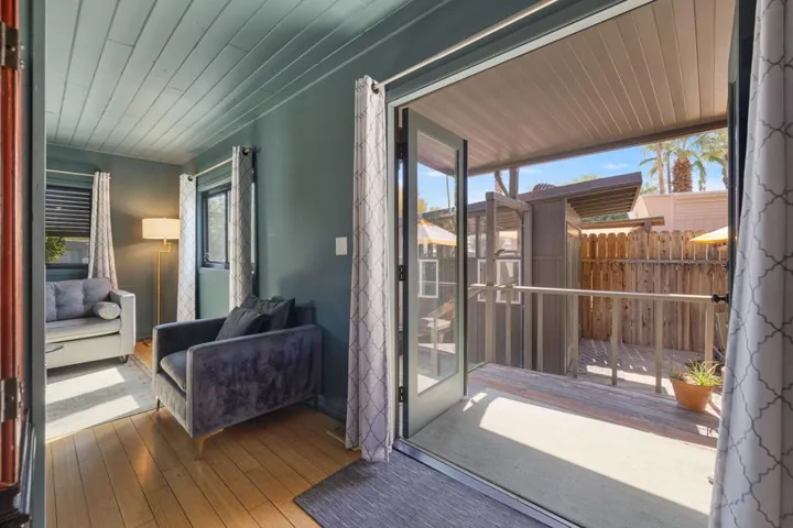 This beautifully renovated 1-bedroom, 1-bath home in the desirable 55+ Ramon Mobile Park is move-in ready and full of charm. Updates include bamboo and tile flooring, fresh paint, a remodeled bathroom, appliances, and French doors that open to a spacious outdoor retreat.The detached studio, currently used as a laundry room, can easily serve as an art studio, workshop, or hobby space. Enjoy a large deck and patio surrounded by mature trees, creating a private oasis perfect for relaxing or entertaining.Fully fenced and gated with great curb appeal, this home is in a prime South Palm Springs location, just minutes from shopping, dining, entertainment, and downtown. Space rent is $886/month. Water, trash, and sewer is a flat fee of $20.50. Metered gas and electricity averaged about $300/month, keeping living expenses very low! The community also offers a heated pool, spa, gym, and clubhouse.