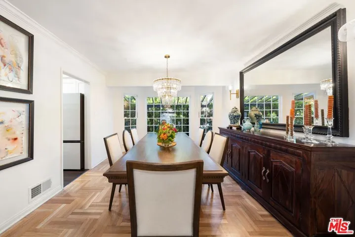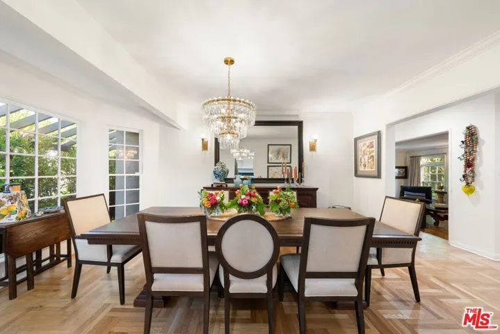 Located in the heart of Longridge Estates, this single-story completely updated traditional residence embodies timeless sophistication, complete privacy, and effortless livability. Behind secure gates, the home reveals a serene retreat surrounded by lush, mature landscaping, an entertainer’s paradise and a private sanctuary all in one. Step inside to discover wood-beamed ceilings, herringbone-patterned floors, designer lighting, French doors, and elegant fireplace mantels that showcase the home’s refined craftsmanship. The thoughtfully designed layout, a true traditional floor plan rarely found today, allows each room to maintain its own character while flowing seamlessly together, perfect for both intimate gatherings and large-scale entertaining. A formal living room anchored by a stately fireplace welcomes guests just off the entry, while the spacious family room with built-in wet bar, additional seating, and direct patio access sets the stage for effortless entertaining. The formal dining room, with seating for eight-twelve beneath a statement chandelier and bay windows, connects beautifully to a well-appointed kitchen featuring stainless steel appliances, shaker-style cabinetry, and generous storage. The primary suite offers a tranquil retreat bathed in natural light, complete with a walk-in closet and a spa-inspired bathroom boasting dual vanities and a large frameless glass shower with custom tilework. Two additional guest bedrooms and a full bath provide comfort and flexibility, while two half baths add convenience throughout. Outdoors, the property transforms into a resort-like escape with a sparkling pool and spa surrounded by manicured greenery, multiple lounging and dining areas beneath a pergola, and an expansive patio ideal for hosting under the stars. The fully gated grounds provide the ultimate sense of seclusion, while the front courtyard offers additional seating areas for quiet reflection or casual conversation.