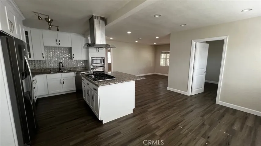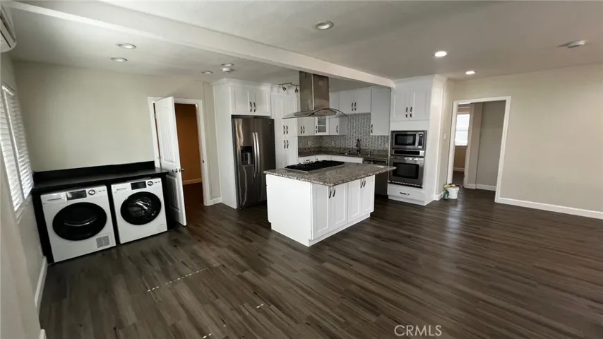 This is a warm real estate rental listing with a 4-bedroom, 2-bathroom home that highlights its key features: in-home laundry, a recently remodeled bathroom, abundant natural light, and a spacious kitchen island with a burner perfect for hosting family gatherings. It also has a white picked fence with large palm trees surrounding the home.