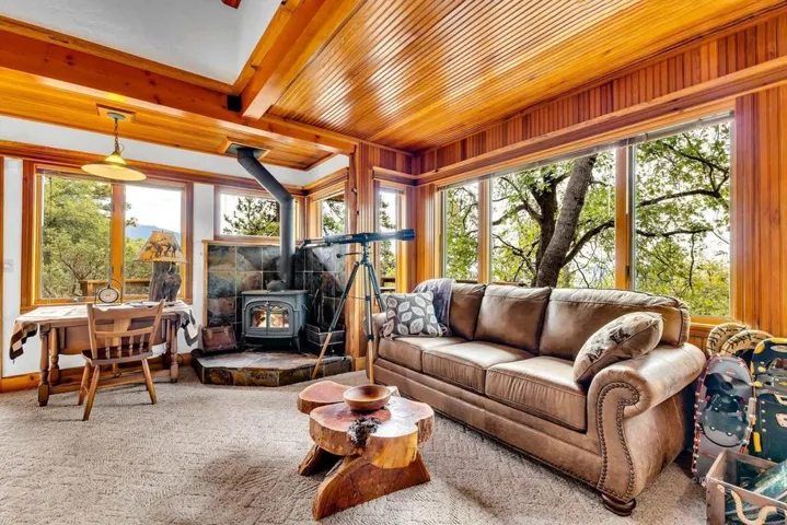 Tucked away in a beautifully forested 1/2 acre, this one-of-a-kind mountain retreat blends master craftsmanship with modern comfort, offering extraordinary attention to detail throughout. From the covered porch walkway, enter into large mud room that then leads to the open-concept living area includes large kitchen, dining area + cozy living room w/ wood stove surrounded by custom stonework. Kitchens and baths feature 3′ single-slab cedar countertops, creating a warm, timeless aesthetic. Off the living room finds the main bedroom suite w/walk-in closet, 3/4 bath w/skylight + laundry room. Craftsman staircase leads to loft + third bedroom w/bath + upper deck. Entry mud room separates main house from charming + self-sufficient guest space, w/kitchenette, 3/4 bath, wood stove + French doors to deck areas. Multi-levels of redwood decks offer space for relaxing + entertaining, enjoying outdoor mountain living at its finest. Many extras, including RV hookup, workshop, fruit trees + more. Come experience this unique home w/a balance of amazing custom woodwork + modern comforts. This is a true sanctuary – one you’ll cherish + never want to leave.