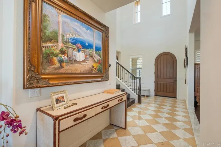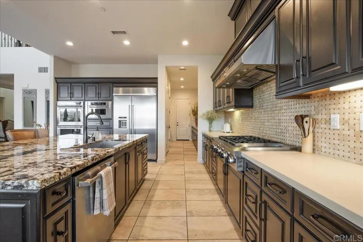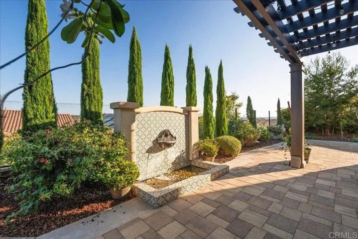 Discover refined living in this exquisite 6-bedroom estate, tucked within the exclusive gated community of Robertson Ranch. Blending sophistication and comfort, this residence showcases soaring ceilings, impeccable architectural details, and exquisite designer finishes throughout. Step inside to find an elegant mix of Carrara Gioia marble, Jurastone Beige tile, and rich hardwood flooring, creating a seamless flow of luxury and warmth. The chef’s kitchen serves as the heart of the home, featuring premium finishes and thoughtful craftsmanship ideal for both entertaining and everyday living. Just off the kitchen, the family room’s glass doors invite natural light and open to the backyard, offering an effortless connection to the outdoors. The primary suite, conveniently located on the first floor, offers a serene retreat of comfort and style. Dual laundry rooms on each level add exceptional convenience. Step outside to your own private retreat—where serene bluff views frame the luxury pergola, built-in BBQ and a breathtaking custom fountain that anchors the expansive patio. The home is also equipped with solar for modern efficiency and ease. Enjoy resort-style community amenities, including a sparkling pool and spa, elegant clubhouse, beautifully maintained parks, and more. Perfectly positioned just 3 miles from the beach, with access to top-rated schools and nearby shopping and dining, this extraordinary property embodies the very best of Carlsbad luxury living.