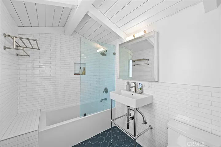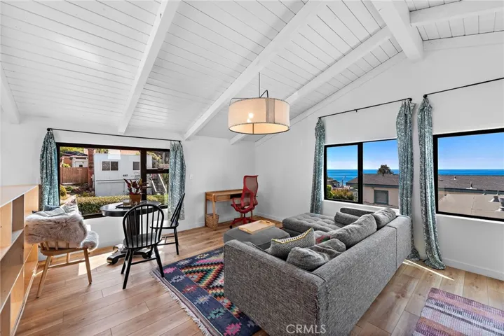 Modern bungalow just a few blocks to the beach in one of Laguna Beach’s most desirable neighborhoods – Woods Cove. This completely remodeled and upper level unit features a bright and airy living room with ocean views and convenient kitchenette with butcher block counter and tile backsplash, refrigerator, sink with garbage disposal, and countertop convection oven, vaulted open beamed ceilings, wood floors, dreamy ocean view bedroom, sleek bathroom surrounded in stylish white subway tile, shared outdoor laundry, and stunning roof top deck with electric awning perfect for alfresco dining with fabulous ocean views all the way up the coast of Laguna Beach. Just a few blocks to some of the finest beaches and coves in the Village or just relax and enjoy the Catalina Island sunsets from home! Free trolley service running every 30 minutes nearby, no car needed! However, there is a dedicated off street parking space and ample street parking for guests. Absolutely ideal location with charming shops and the top rated restaurants and bars of Laguna all within walking distance.