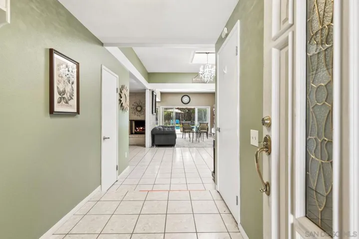 Experience the perfect blend of indoor-outdoor living in this bright, open-concept home within Poway’s highly acclaimed school district, renowned for academic excellence. This unique residence features a dramatic central atrium with skylight and welcoming entry skylight. The seamless floor plan flows from the front entrance to the pool patio, creating an ideal entertaining space. The spacious layout showcases soaring 10-foot ceilings in the master bedroom, atrium, and living room. Large windows throughout flood the home with natural light. The living space features a striking brick accent wall with fireplace, creating a warm focal point. The impressive kitchen boasts granite countertops, stainless steel appliances, and abundant storage space. The grand kitchen island overlooks and opens to both the living area and backyard. A separate drink counter with additional cabinetry and wine fridge adds entertaining convenience. Step outside to your well-maintained backyard featuring a sparkling pool, large covered patio, beautiful landscaping, and mature trees—perfect for hosting gatherings. The large primary bedroom includes an ensuite bathroom, mirrored closet, and sliding door leading to the private backyard. Practical updates include an epoxy garage floor, enhanced storage solutions throughout and leased solar system. Located just one block from beloved Old Poway Park with its historic train, weekly farmers market, and frequent festivals. Walk to exceptional schools including Midland Elementary, with easy access to Twin Peaks Middle School and Poway High School. This prime.. location puts you within Poway’s highly acclaimed school district, making it a sought-after destination for families prioritizing quality education. The walkable neighborhood provides convenient access to hiking trails, two major shopping areas, and public transportation. This exceptional property combines modern comfort with small-town charm in one of Poway’s most desirable locations.