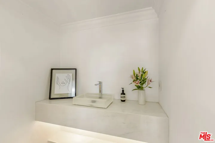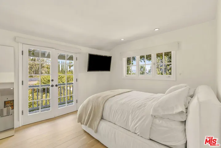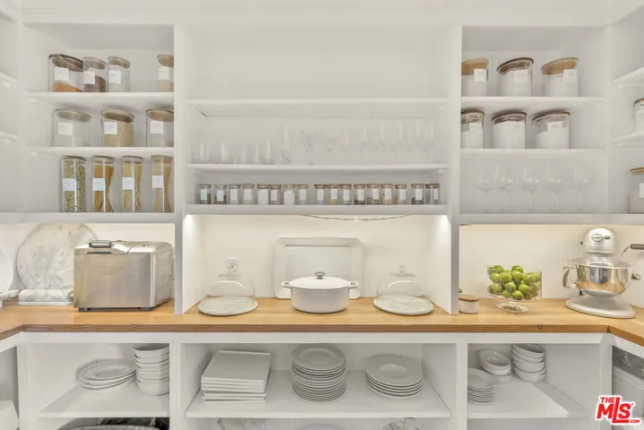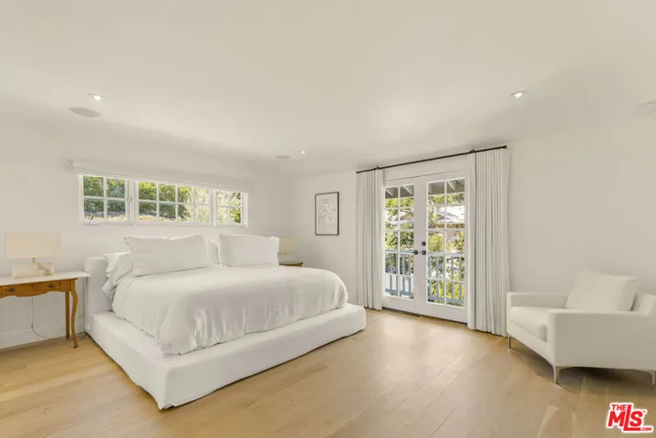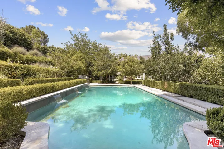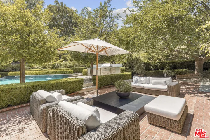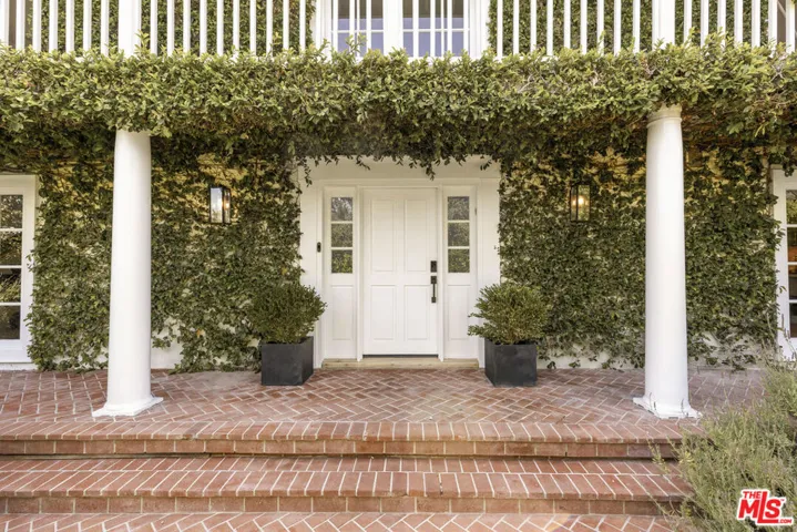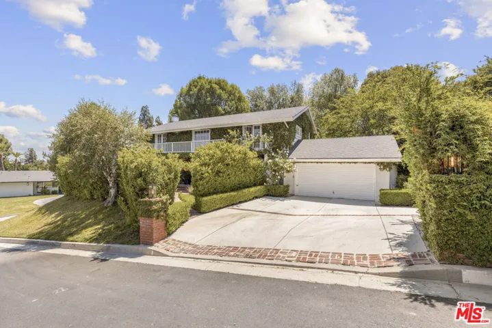 Framed by climbing ivy, white columns and a brick path, 5020 Bilmoor Avenue is a character-rich Country English Traditional set on over half an acre corner lot South of the Boulevard. Step inside to bright, gallery-white interiors and newly refinished wide-plank hardwood floors that set a calming, modern tone. A formal living room centers on a marble fireplace, while the expansive family room unfolds beneath a vaulted, tongue-and-groove ceiling with French doors on both sides for effortless indoor-outdoor flow. The custom chef’s kitchen pairs a custom Regina honed marble countertop with a double-wide Sub-Zero refrigerator/freezer and Gaggenau appliances. The kitchen flows to the dining area, walk in pantry and downstairs powder + laundry room.Upstairs, the primary suite features treetop outlooks and a romantic balcony, and a spa like bath with marble floors, a freestanding soaking tub, and classic wainscoting. Three additional bedrooms and a full bathroom complete the top floor. A show stopping backyard features an oversized pool with trio water features, manicured parterre hedges, terraced flowering beds, and a fruit orchard to create a private, estate-like setting. Entertain on brick patios beside an outdoor kitchen with Viking appliances, or lounge by the pool. The detached garage has been transformed into a professional-grade music studio complete with an iso-booth – an inspiring creative haven with a storied legacy of legendary artists. 5020 Bilmoor Ave combines a rare blend of charm, privacy and luxury in one of Tarzana’s most sought-after pockets.