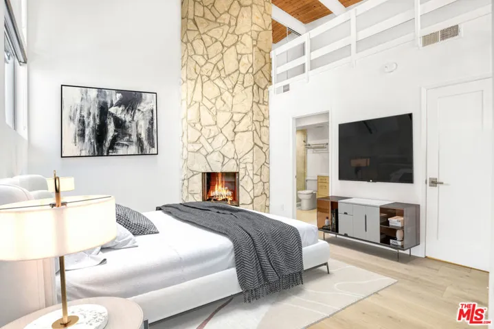 Stunningly remodeled and reimagined 2 bed (+ loft), 3 bath Single Family Home alternative townhome with Getty views in the heart of Brentwood. This 1,916 sqft corner unit was completely remodeled in 2025 with timeless design and modern sophistication. The main level features an open-concept living and dining area anchored by a large stone island, flowing into a chef’s kitchen with custom oak casework cabinetry, stone counters, and high-end stainless-steel appliances. Twenty-foot, floor-to-ceiling windows and wide-plank French oak floors extend throughout, enhancing the abundant natural light and spacious feel. A versatile loft provides the perfect flex space for a home office, den, or guest retreat. The primary suite offers a marble-clad bath, generous closet space, a second fireplace, and views of the Getty Museum. Secondary bedroom and baths are equally refined, showcasing attention to detail and thoughtful design. Additional features include in-unit washer & dryer, central AC and heat, and two side-by-side gated parking spaces. Located in an intimate postmodern building with only nine residences, this townhome offers privacy and proximity to San Vicente’s premier dining, boutiques, and cafes.