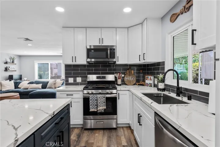This beautifully maintained home is a must-see! Featuring 2 bedrooms, 2 bathrooms, and an additional multipurpose room ideal for a private office, hobby space, or extra storage, this residence spans approximately 1,440 square feet and is ideally positioned on a single-loaded street, providing enhanced privacy and minimal traffic. Step through the spacious covered porch into a bright, open concept living and dining area filled with natural light and finished with designer paint tones that create a warm, welcoming ambiance. The home’s tasteful décor and farmhouse charm make it feel cozy, fresh, and move-in ready. The remodeled kitchen is a true highlight showcasing custom white cabinetry, quartz countertops, a subway tile backsplash, newer gas range, stainless-steel microwave, dishwasher, and a large center island perfect for casual gatherings and entertaining. A sliding glass door leads directly to the covered porch, making it easy to enjoy the peaceful surroundings. Both bedrooms are generously sized, with the primary suite offering a walk-in closet and a fully updated en-suite bathroom featuring dual vanities, stylish lighting, and a walk-in shower with modern finishes.