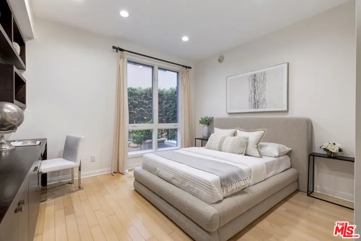 Serene one-level luxury condo in Prime Beverly Hills with a RARELY-FOUND apprx 525 sqft 2-sided garden patios! Ideal for pet owners and those wanting a pretty yard for backyard space. Discover indoor-outdoor living at its best in this pristine 1719 sqft unit at the prestigious Almont Plaza. Ideally situated on a quiet, tree-lined street just north of Wilshire, this beautifully updated 2-bedroom, 2.5-bath condo feels like a ‘private home’ complete with lush wraparound garden patios that create a tranquil retreat in the heart of the city. Located in a secure building, this rare corner unit offers complete privacy and a seamless flow for relaxed living and elegant entertaining. The expansive layout features a gracious foyer opening to a large living room with fireplace, custom built-ins, bar and walls of glass doors that bring the gardens in. The oversized formal dining room sets the stage for memorable gatherings. A bright, airy kitchen opens to the patio and is outfitted with top-tier appliances including a Sub-Zero fridge, white cabinetry, a spacious breakfast area, and side-by-side laundry. Designer finishes, wood floors, and oversized windows add sophistication throughout. The generous primary suite boasts a remodeled spa-like bath and an oversized walk-in closet. The second bedroom is equally spacious with a private ensuite bath, plus there’s a beautiful powder room for guests. Additional highlights include a full security system, 2-car side-by-side parking in a gated secured garage, and access to luxurious building amenities: a stylish lobby, gym, sundeck, and meeting room. Water and EQ insurance included in HOA dues. Walk to restaurants and enjoy the best of the Beverly Hills lifestyle, renowned shopping, entertainment, Beverly Hills school district, police and fire. Easy to show – This rare garden gem won’t last!
